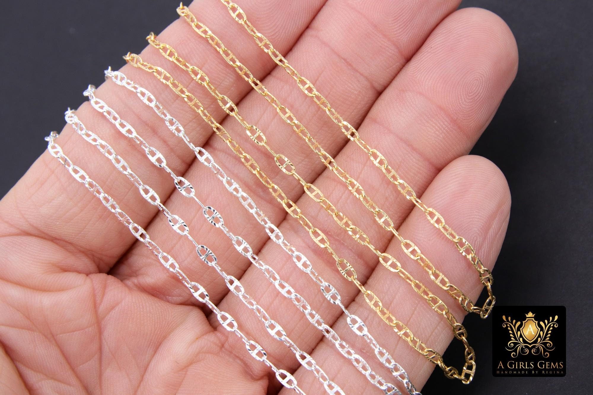 Notes Regarding Chains: All of our chains are cut in a continuous chain unless it is the end of a roll. We do not cut 10 feet in 1 foot sections. Any 925 Sterling Silver or Silver plated chains will tarnish. We suggest keeping your chains in a sealed jewelry bag to help prevent this. I'm sorry but all cut chains are non refundable. We recommend you try a foot sample before large purchases. Stainless steel chains come in gold or silver and are known for their non tarnishing properties. We don't control the colors, where gold may be applied on tight weave or small chains. All of our 14 K Gold Filled chains, charms, or findings are Genuine 14/20 Gold Filled. To be called gold filled by US LAW, the plating needs to be very very thick, at least 5% of weight.
