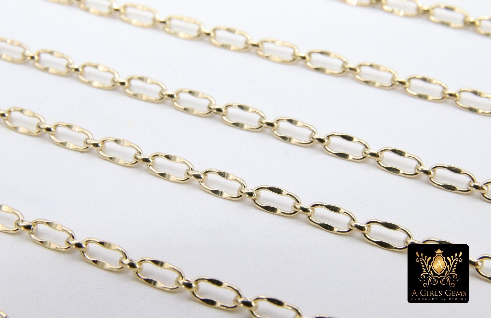 14 K Gold Filled Dapped Paperclip and Rolo Chains, Elongated Oval, Rectangle Hammered Chains