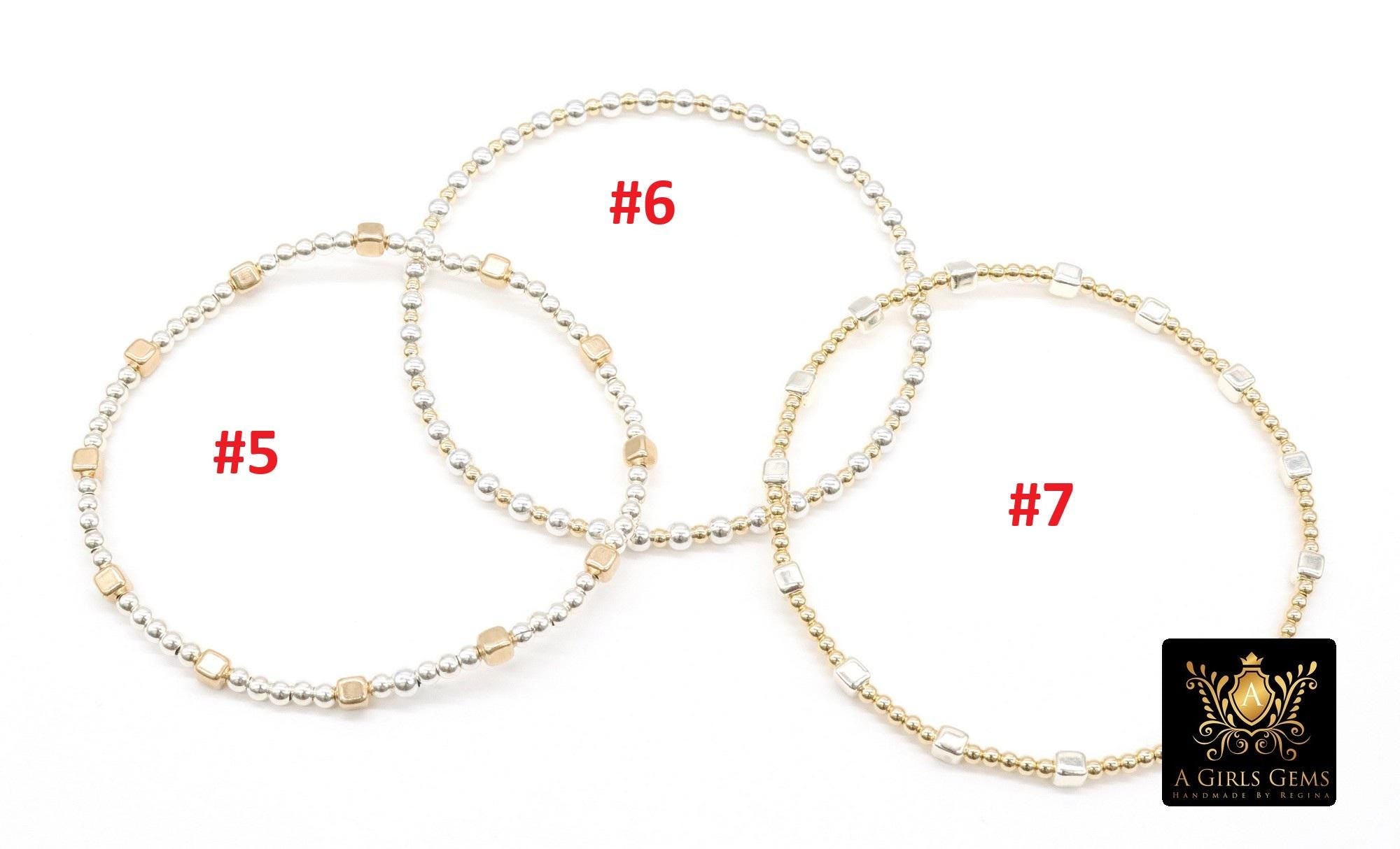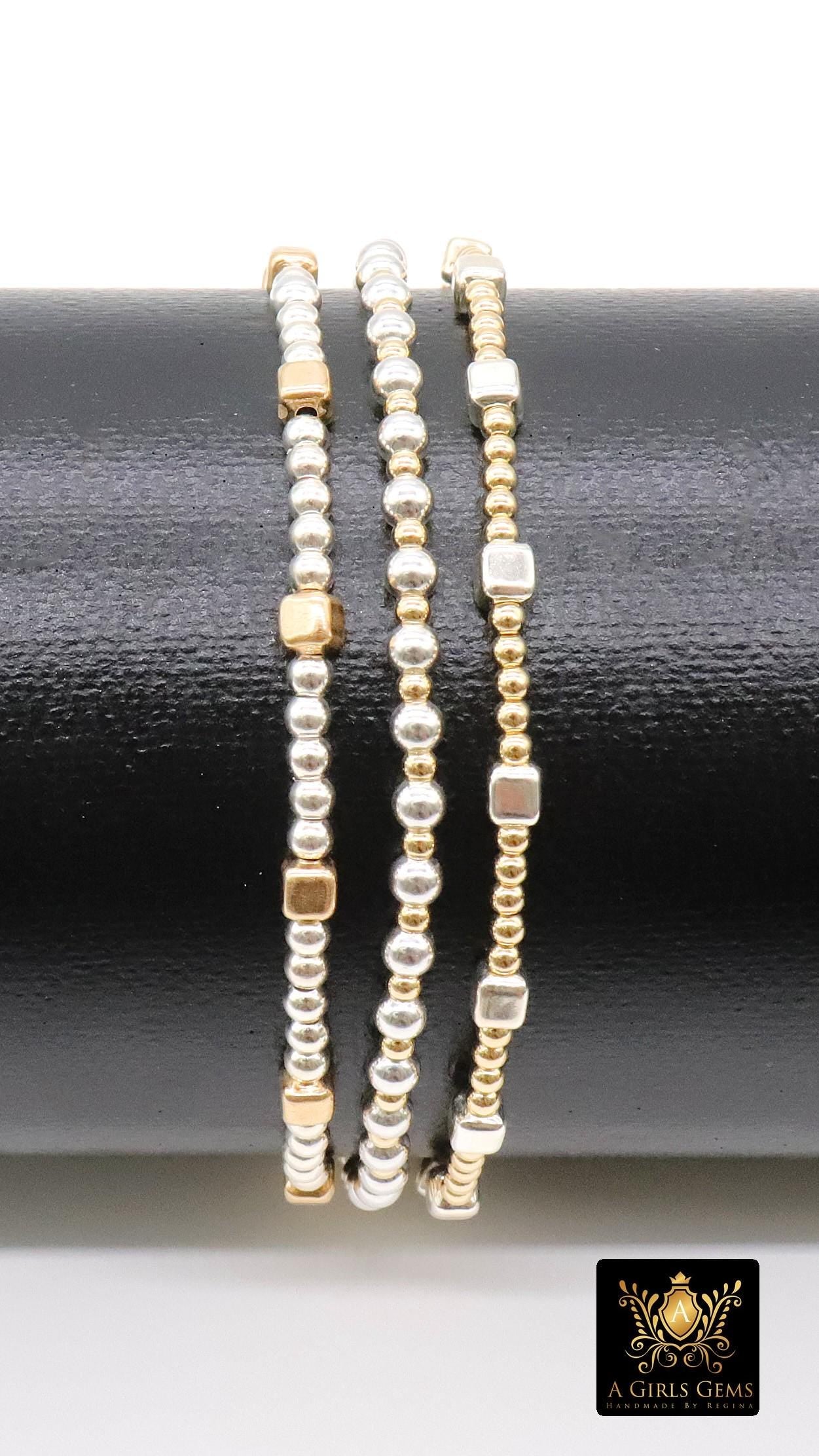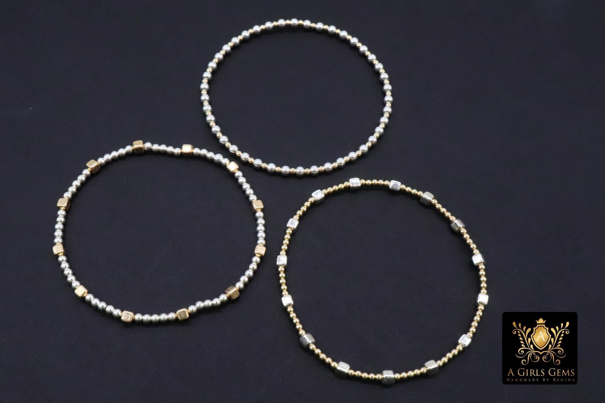 14K Gold Filled Cube Beaded Bracelet, 925 Sterling Silver Mixed Metal Stretchy Women's Bangle, Square Bead Stacking Bracelets