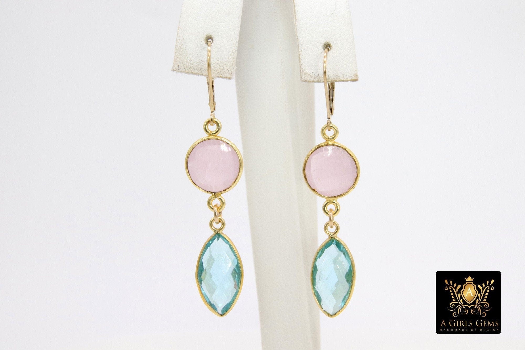 Rose Quartz and Blue Topaz Gold Earrings, 14 K Gold Filled Lever Back Hooks, Marquis Leaf Gemstone Dangle Earrings