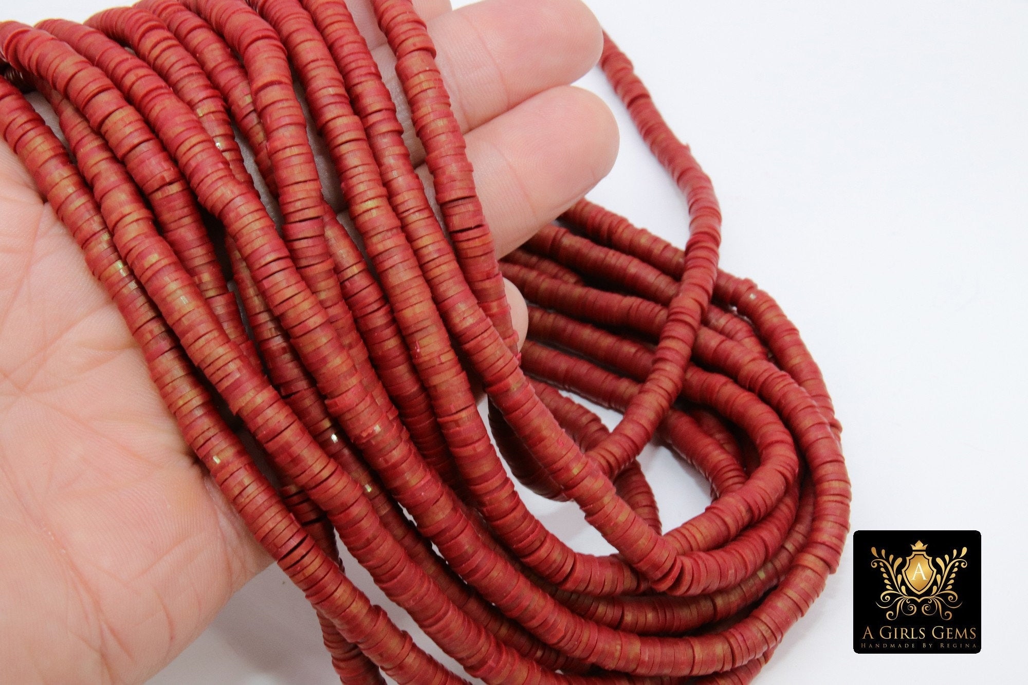 2 Full Strands of Flat Heishi Beads in 6 mm in Burgundy Red with Hints of Gold throughout