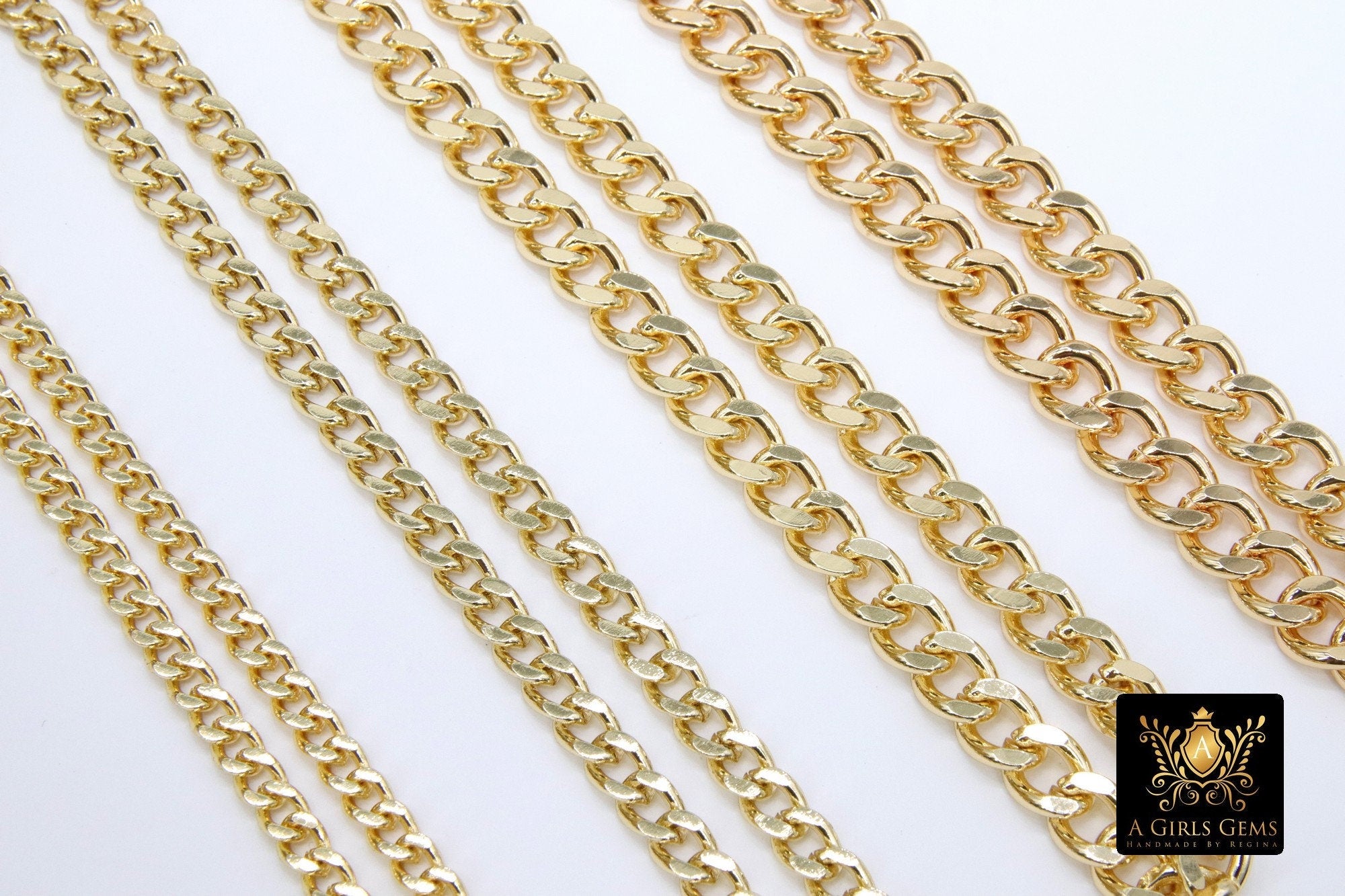 This chain has a diamond cut edge and comes in four different sizes. The pictured chains in the photo shows the width sizes of each chain. These are plated steel chains and you will find them to be more of the gold plating that you find on our brass chains as far as the color.