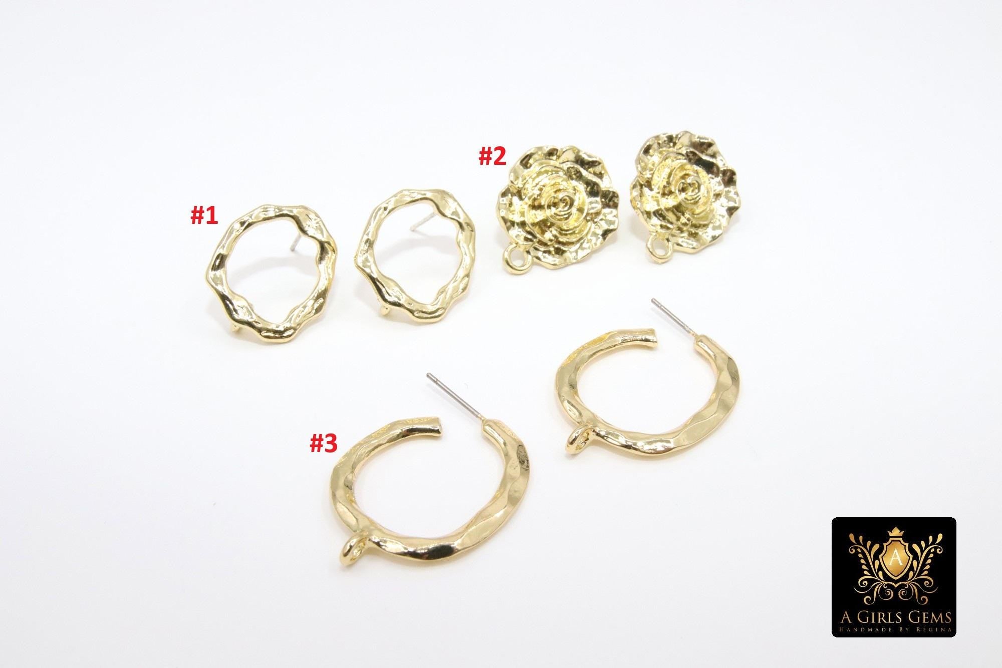 Gold Post Stud Earring Findings, Gold Plated Round, Oval, Square, Rectangle Shaped Post Earrings, 4 Styles, Posts with Loops For Charms