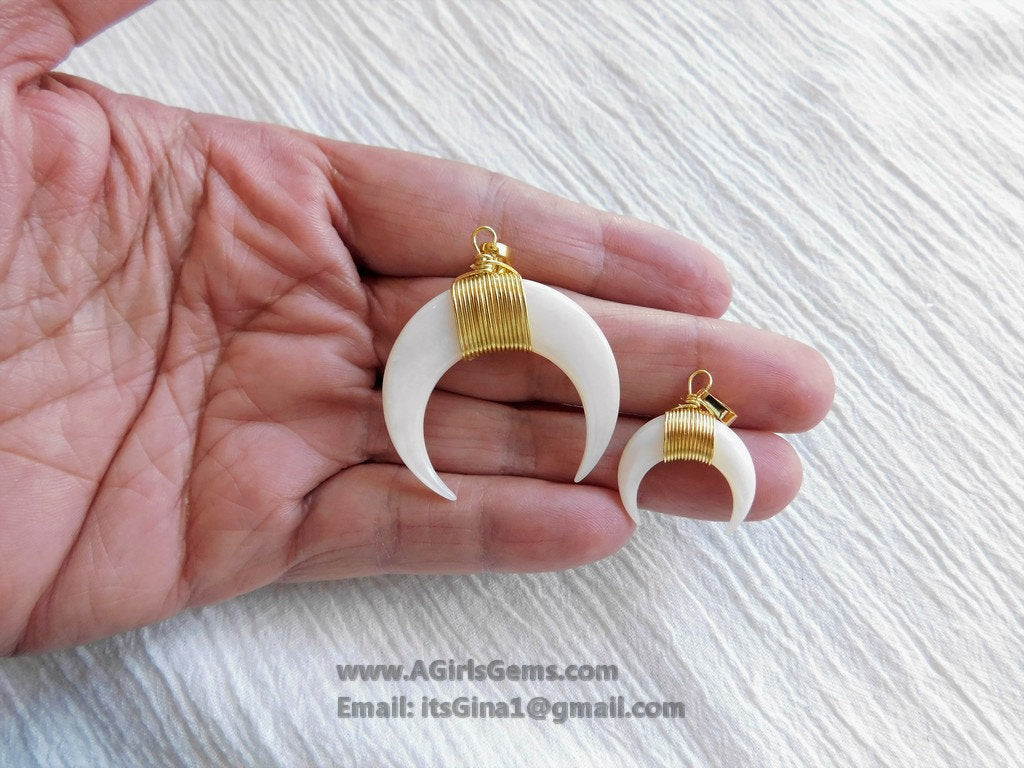 Small Double Horn Pendant, White Mini Natural Shell Crescent Moon Charms, 20 mm Gold Wire Horn Boho Pendant DIY Jewelry B36