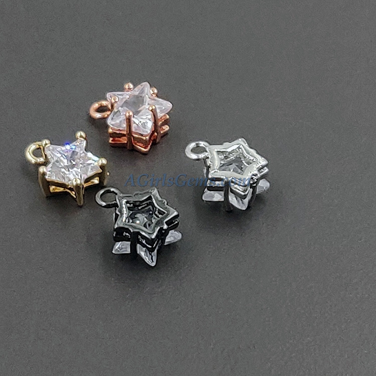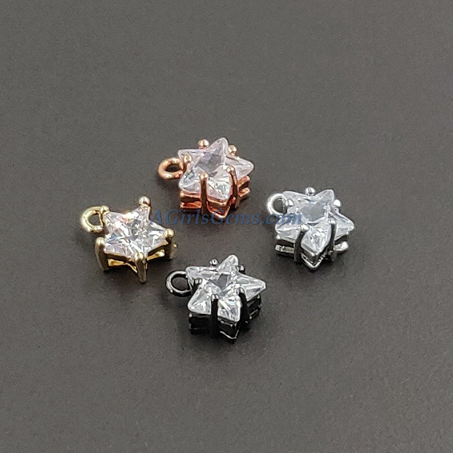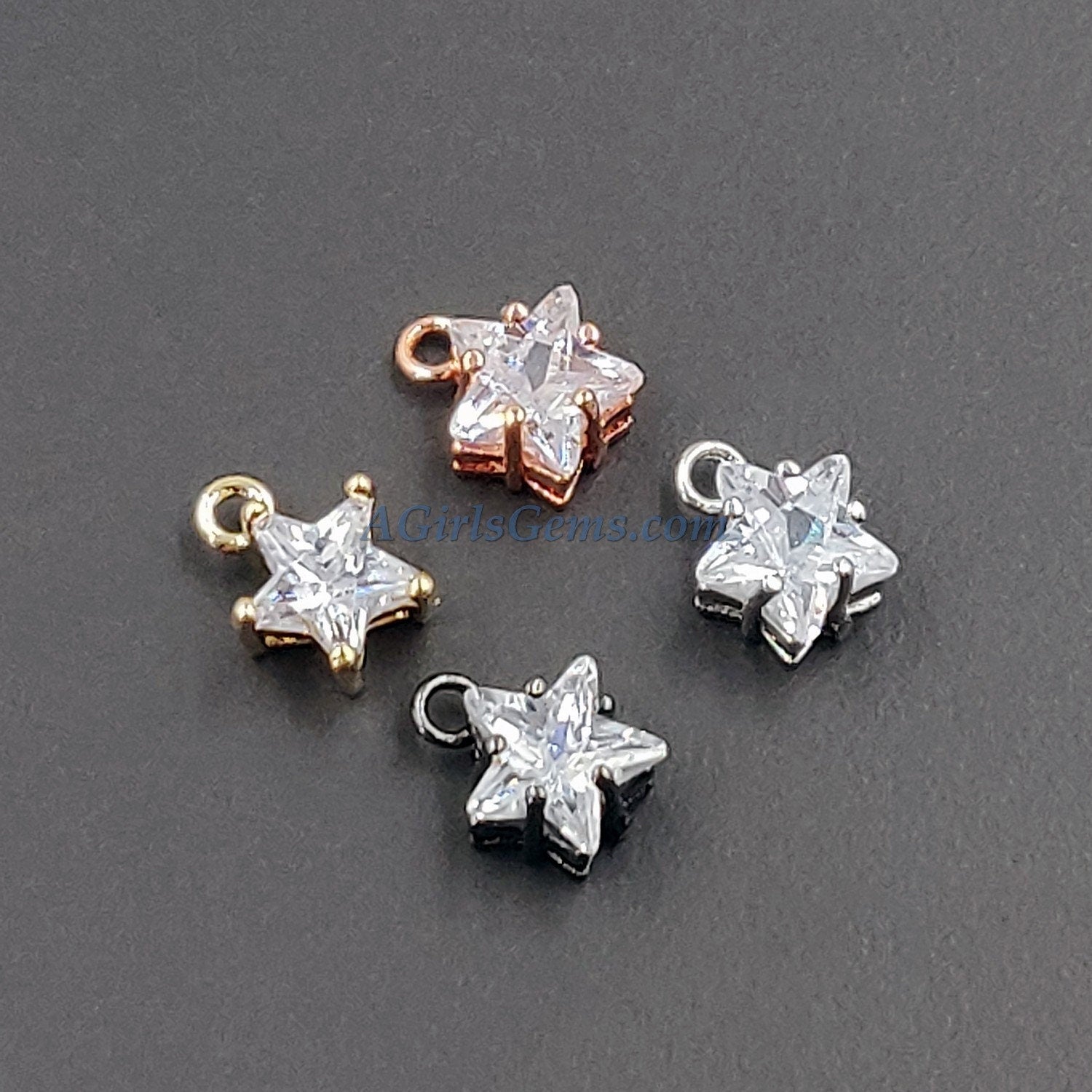 Star Charms CZ Solitaire - 3 Pcs - Tiny Star Dangles, 8 x 10 mm Cubic Zircons, Black/Silver/Rose/Gold Pave Crystal Earring Findings/Choker