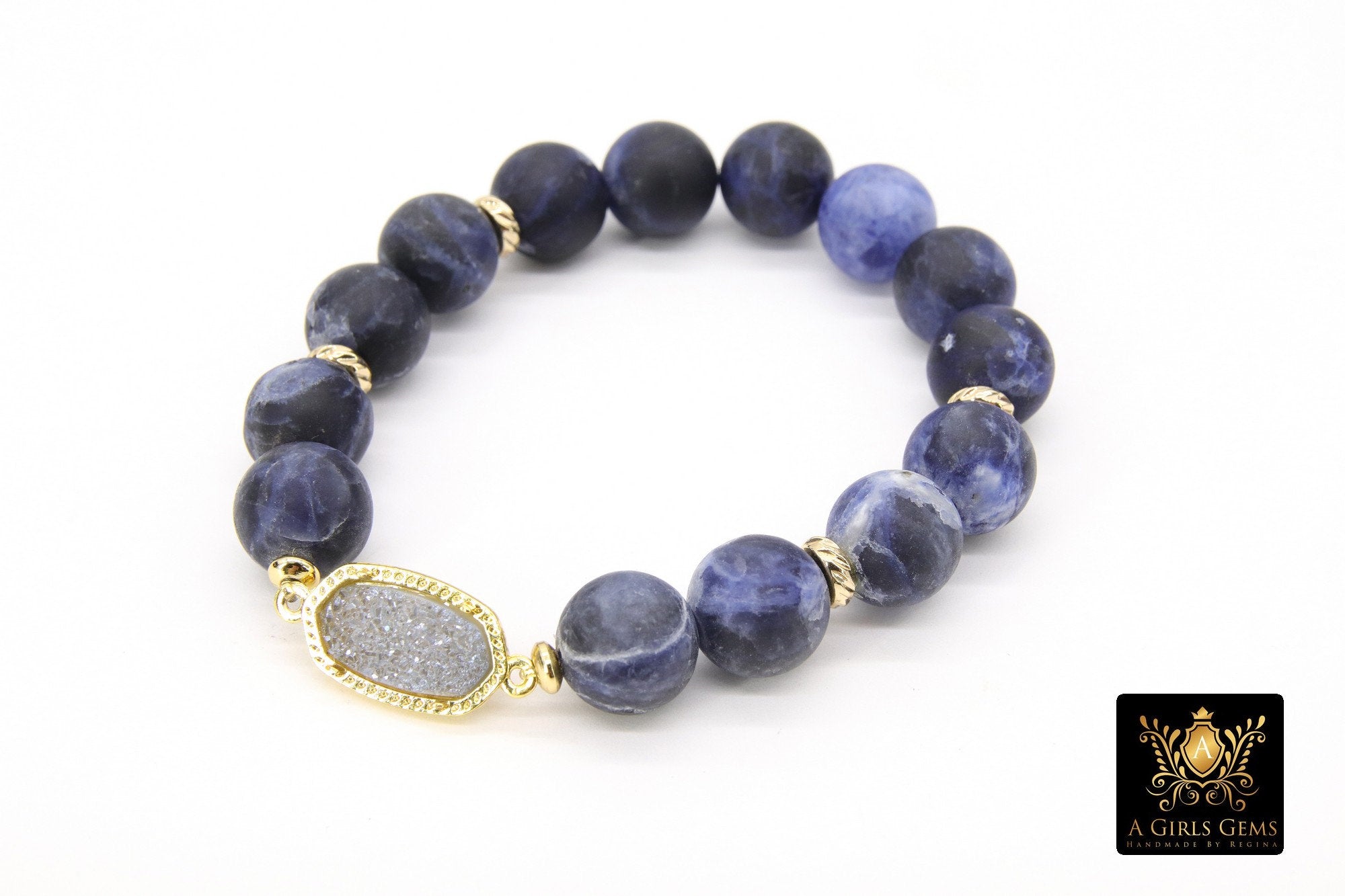 Blue Navy Druzy Beaded Bracelet, Sodalite Gold Stretchy Bracelet #795, Druzy Charm Bracelet