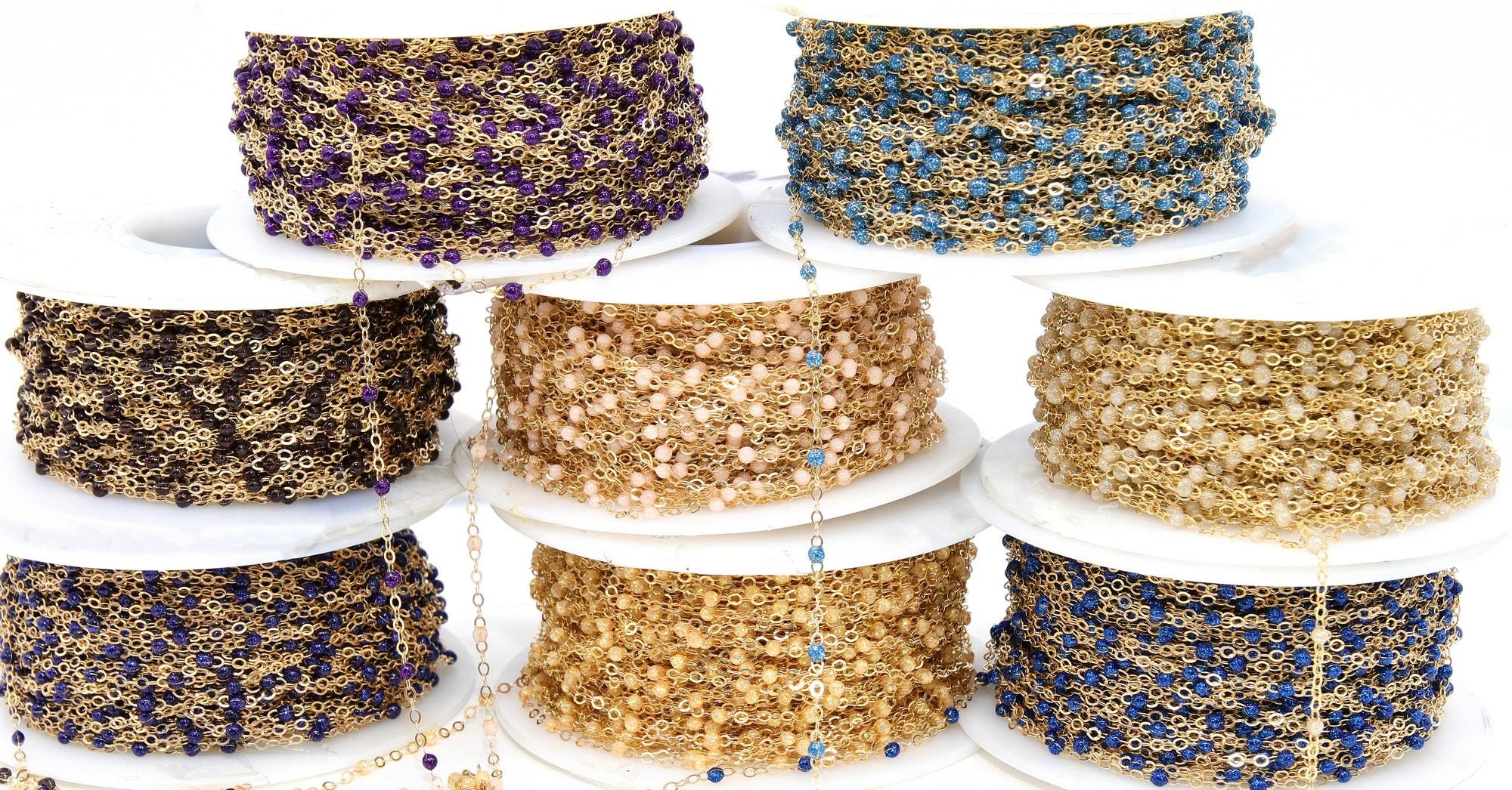 Choice of color of beaded enamel Satellite chains in 14 K Gold Filled. Mix and match colors for any event! Great for Spirit or Sports events necklaces. This is a lightweight chain that is soldered between each link. Bead sizes, bead placement, and chain colors can vary. Can use Jump ring size: 24~20 gauge and beads are approximately 2 mm but may vary.