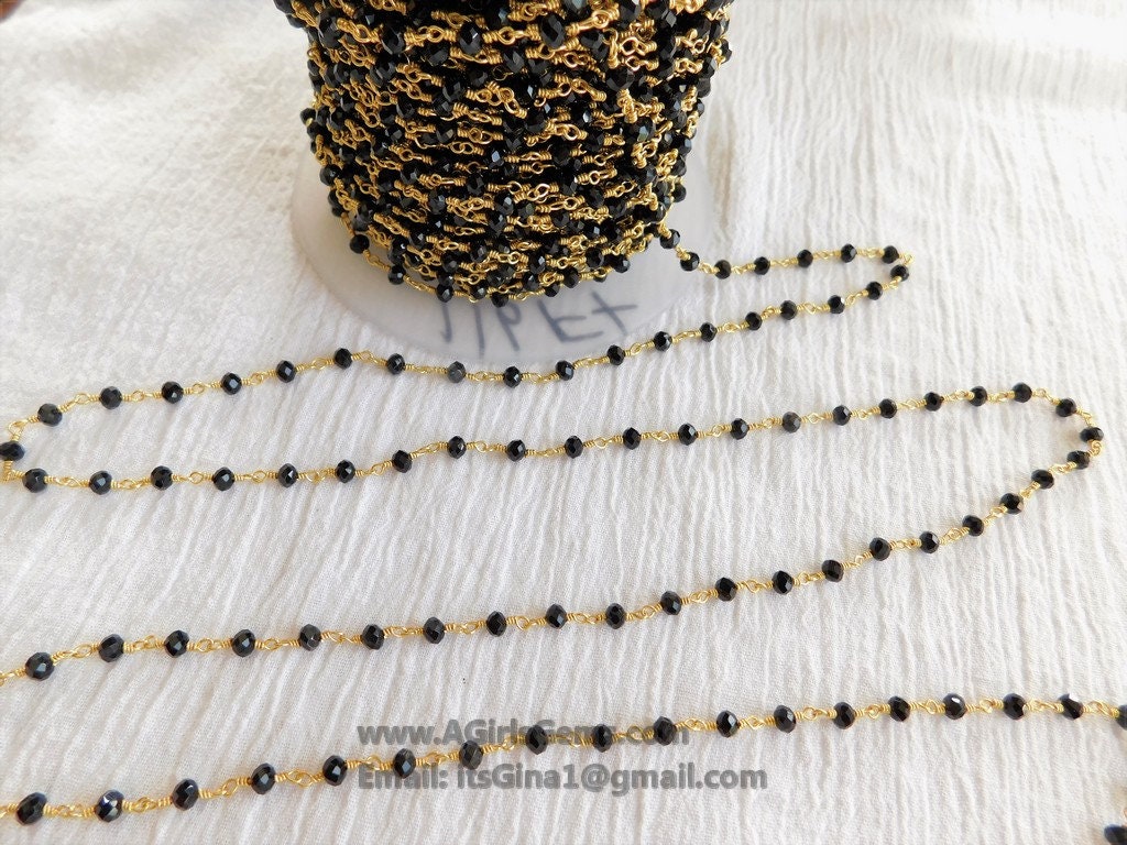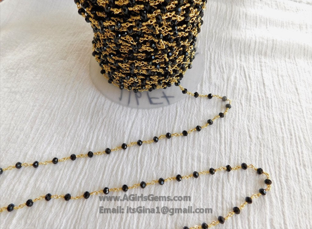 22 k Gold Black Rosary Chain, 4 mm Beaded Rosary Chain CH# 343, Gold Wire Wrapped Rondelle Beads