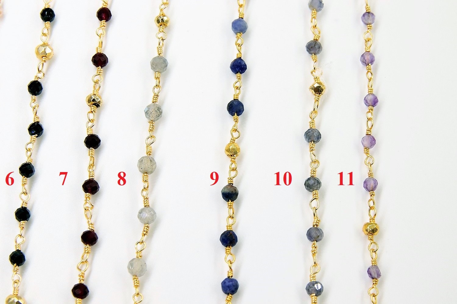 NOTE: You can find these chains in #1 Blue Turquoise, #2 Pink Tourmaline, #3 Rhodonite, #4 Strawberry Quartz, #5 Pink Moonstone AKA Sunstone, #6 Black Spinel, #7 Ruby, #8 Labradorite, #9 Sapphire, #10 Iolite AKA Water Sapphire (violet purple) and #11 Amethyst in all Natural Gemstone chains.