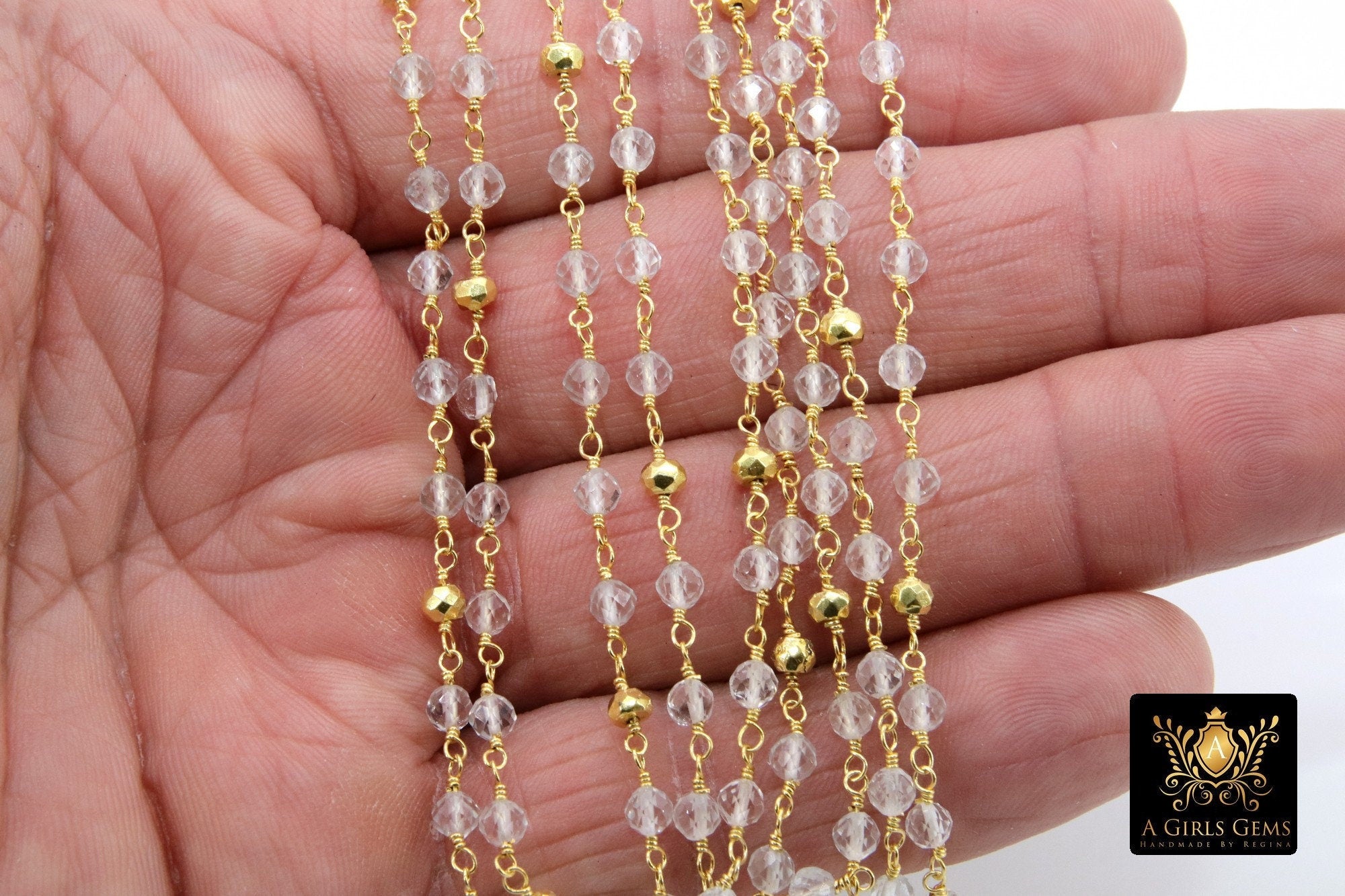 Clear Quartz Rosary Chain, 4 mm Gold Pyrite Beaded Chain for Boho Jewelry Chains Glass Beaded Rosary Roll Bulk Wholesale, By The Foot