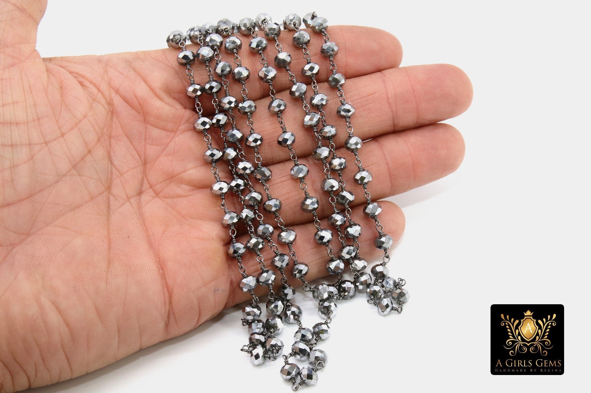 Gunmetal Black Crystal Rosary Chain, 6 mm Silver Wire Wrapped Crystal Beads CH #402, Unfinished Jewelry Chains Bulk