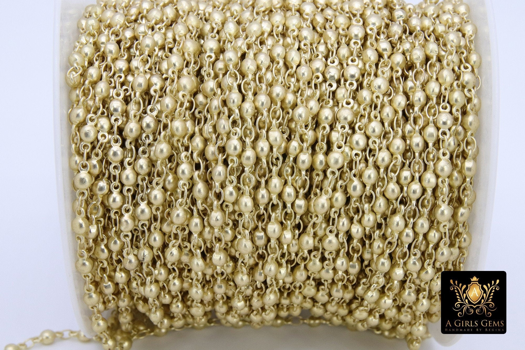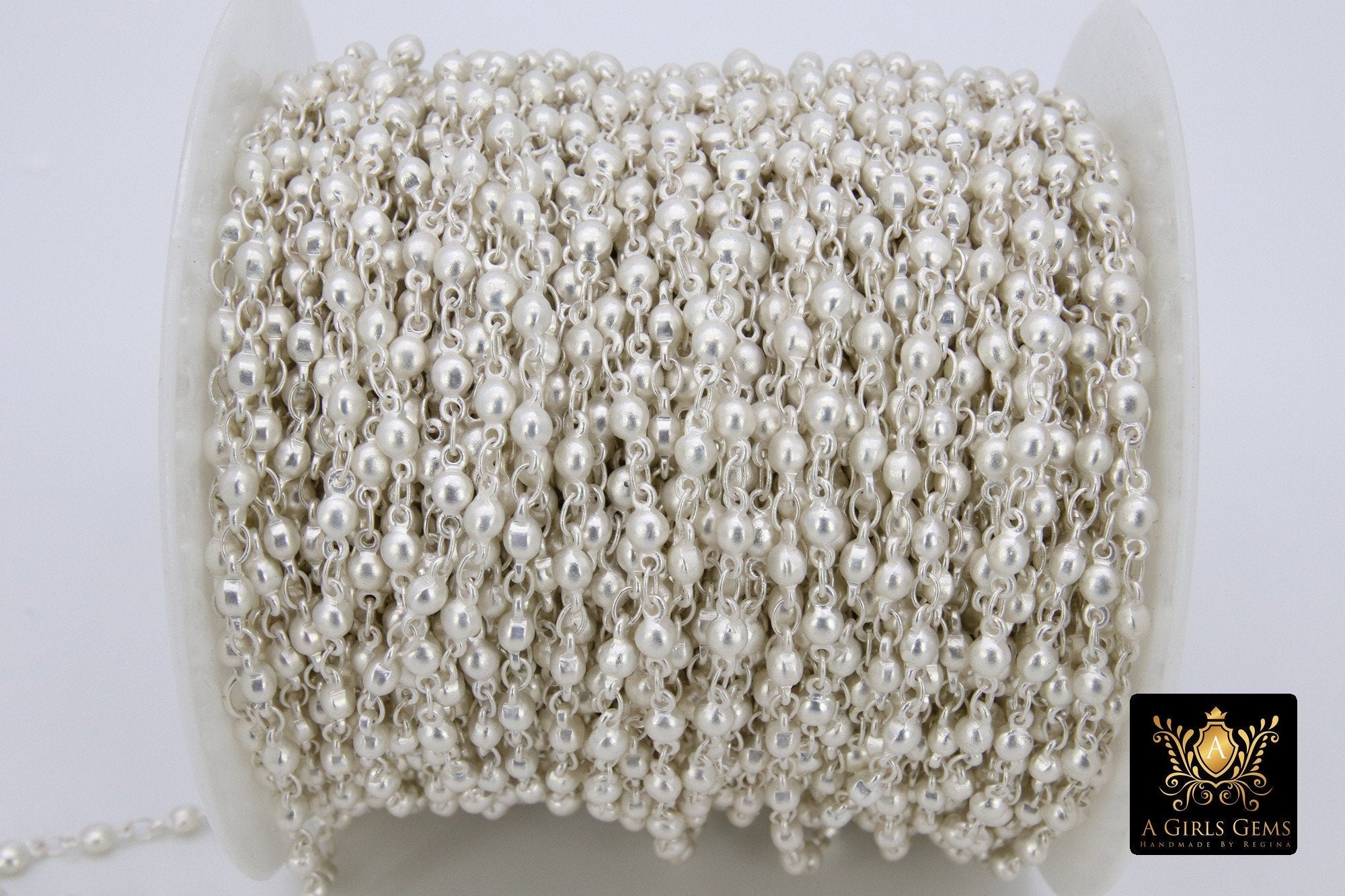 Matte Gold or Silver plated beaded chains in a round 3 mm beaded chain. The beads have a soldered ring that links them together so that you have no waste in cutting a bead away from your chains.