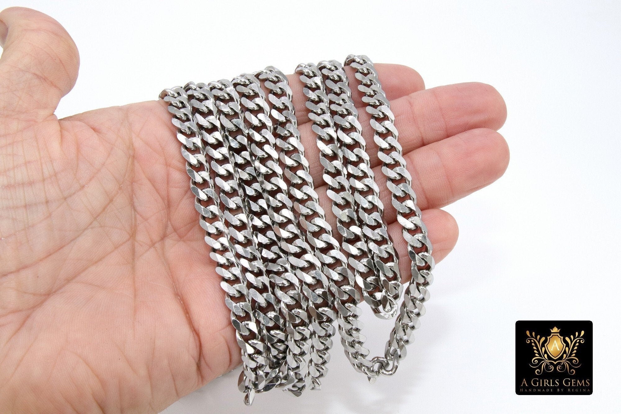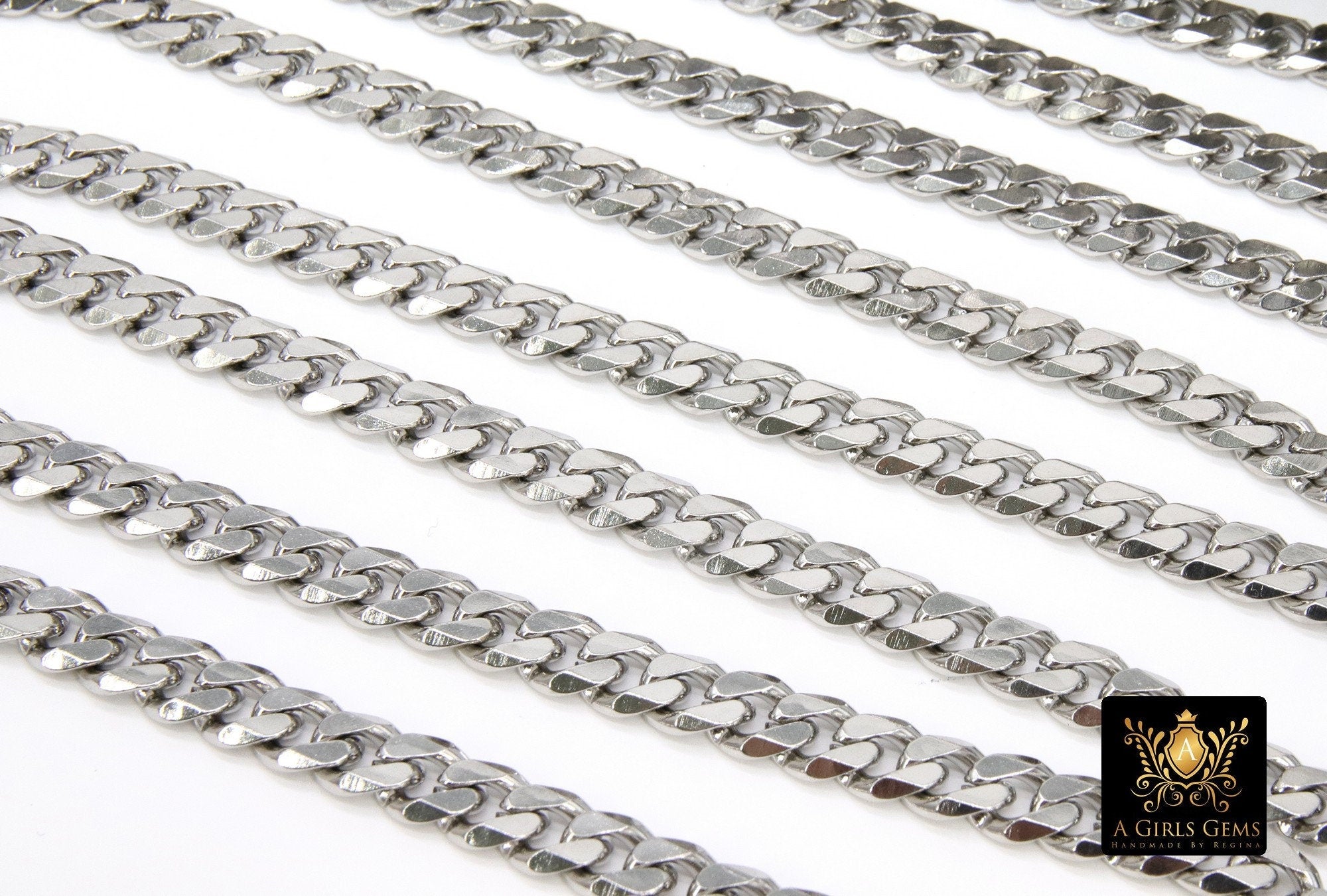 Silver Flat Curb Chain, 10.5 mm Stainless Steel Large Heavy CH #210, 304 Fancy Cuban Diamond Cut Oval Unfinished Chains