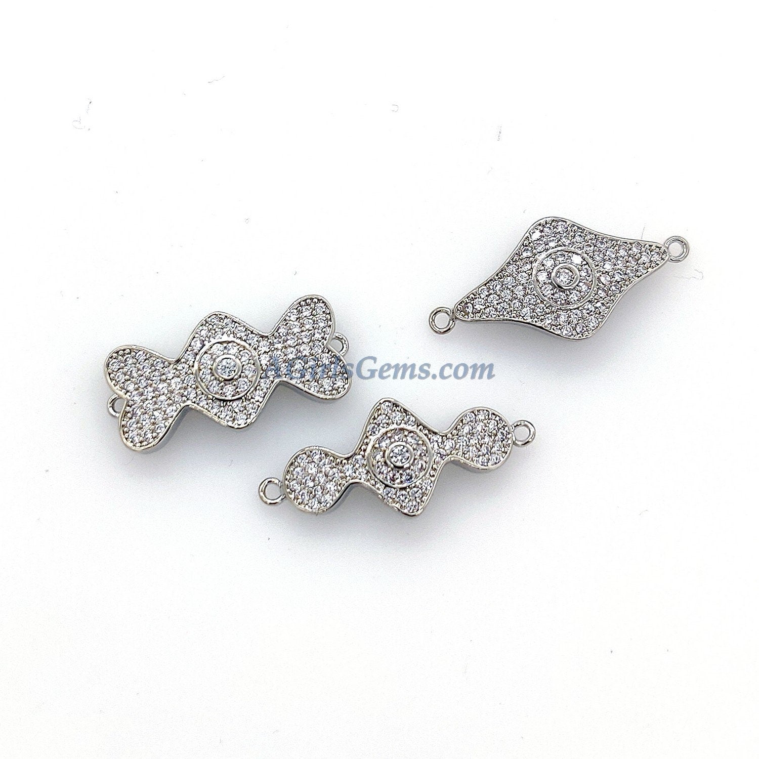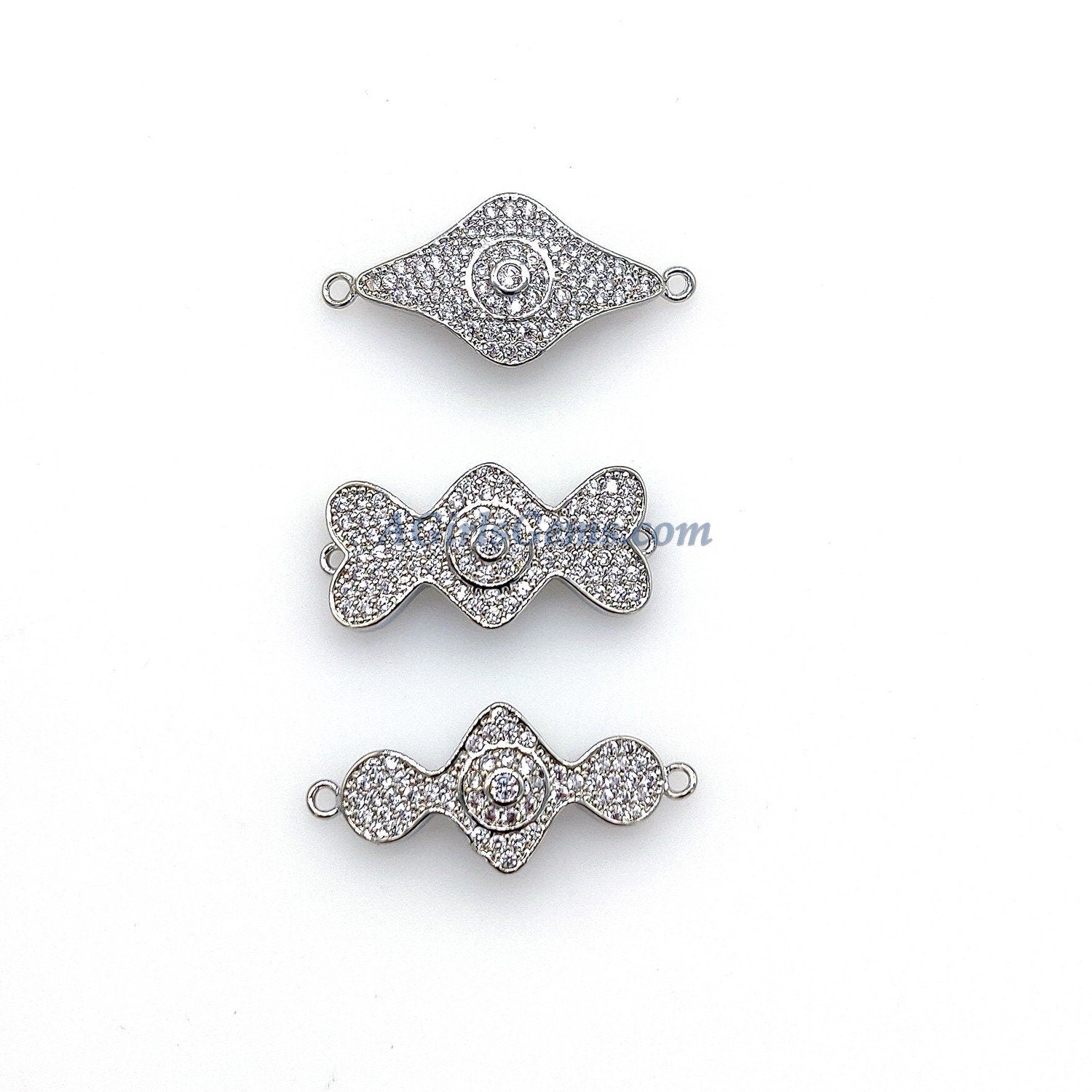 CZ Micro Pave Curved Bracelet Connectors, Silver Rhodium Plated Evil Eyes Spacer Beads for Dainty/Rosary Chains, Links with Two Loops AG #76