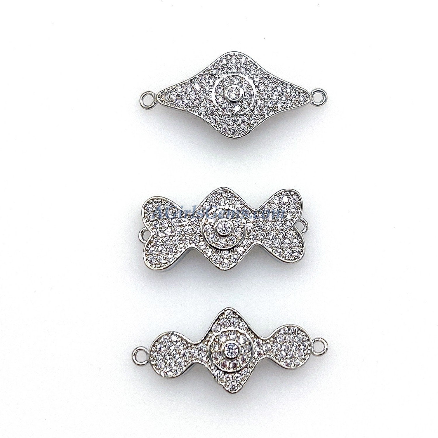 CZ Micro Pave Curved Bracelet Connectors, Silver Rhodium Plated Evil Eye #76, Linking Charms for Dainty/Rosary Chains