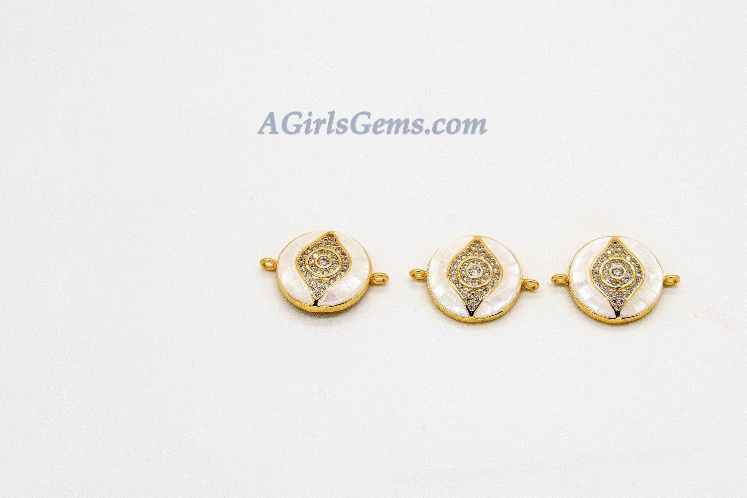 Evil Eye Connector or Charms, CZ Pave Gold Shell White Evil Eye Protection #393, Mother of Pearl Evil Eye