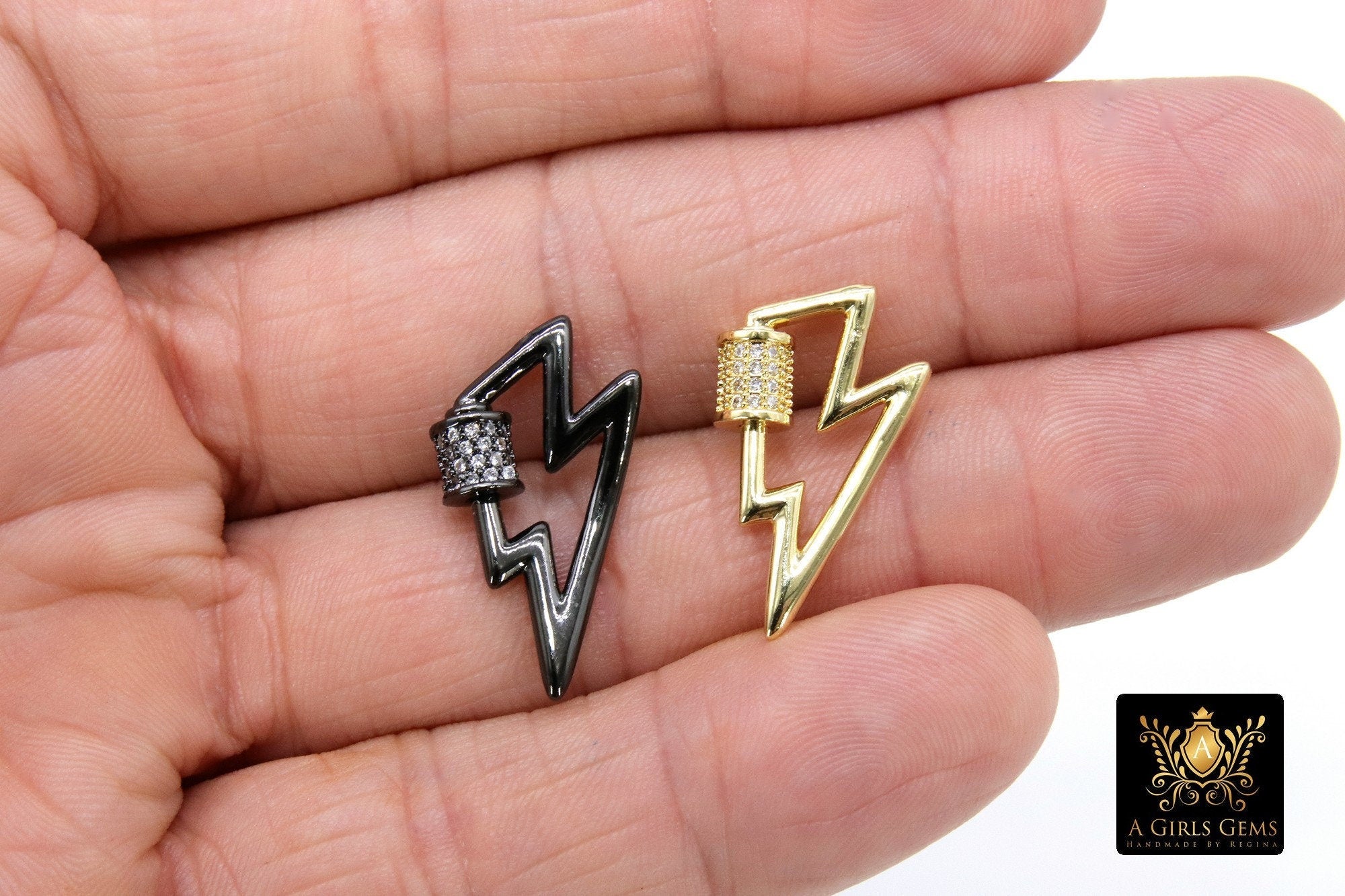 Gold Lightning Bolt Screw Clasps, Silver Carabiner Cubic Zirconia Thunder Bolt #2340, Black Necklace Bracelet Interlocking Charms