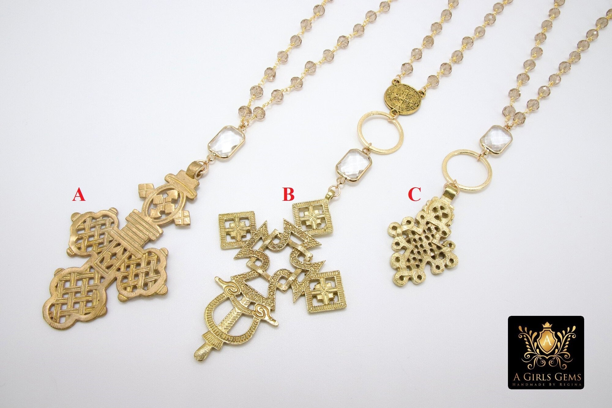 Style A is our Fancy Ethiopian Cross with a Rectangle Bezel show with the Smoky Rosary Chains.