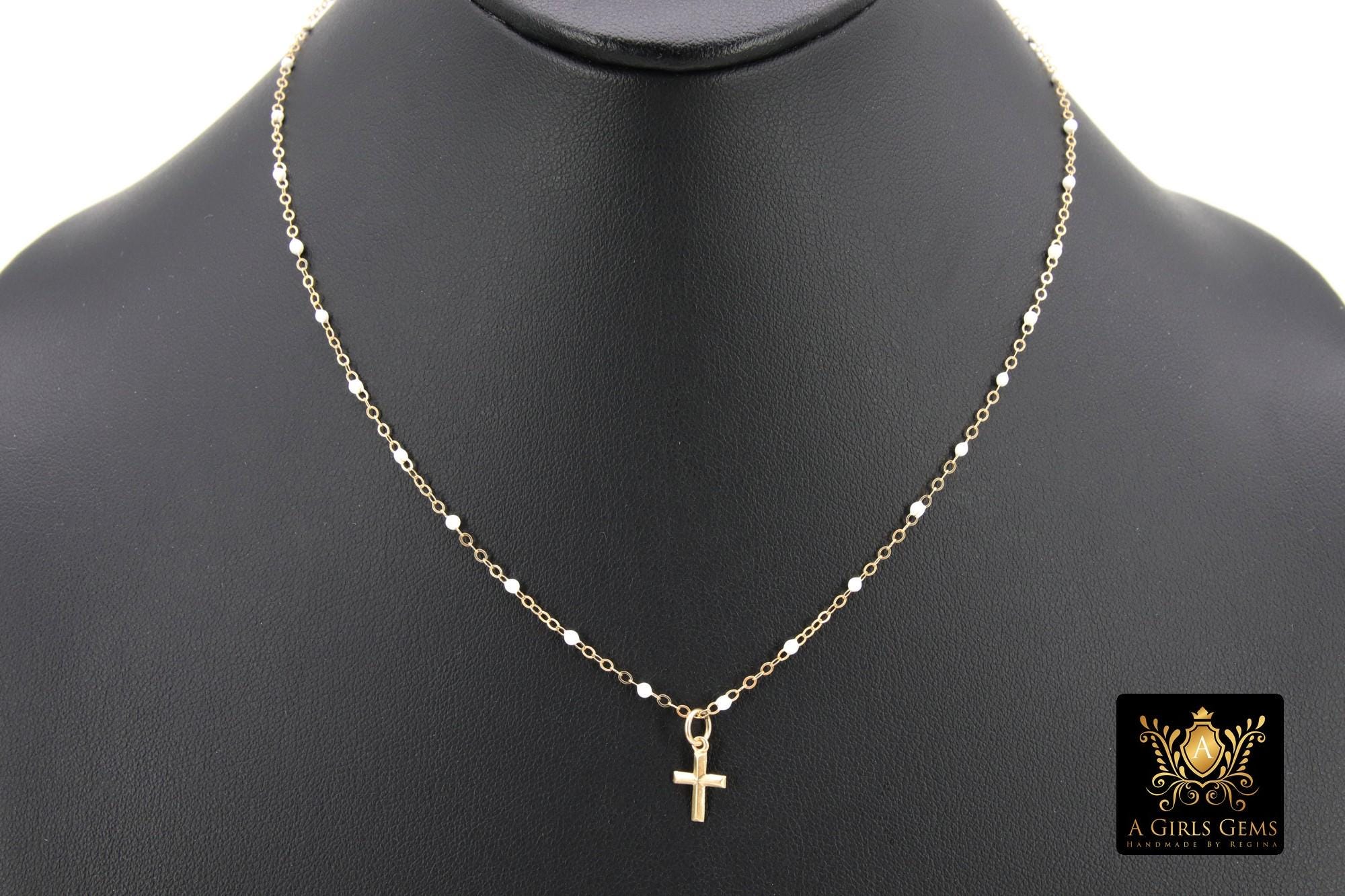 14 K Gold Filled Dainty Cross Satellite Necklace #2626, Dainty Enamel Everyday Choker, Beaded Enamel Chain Links