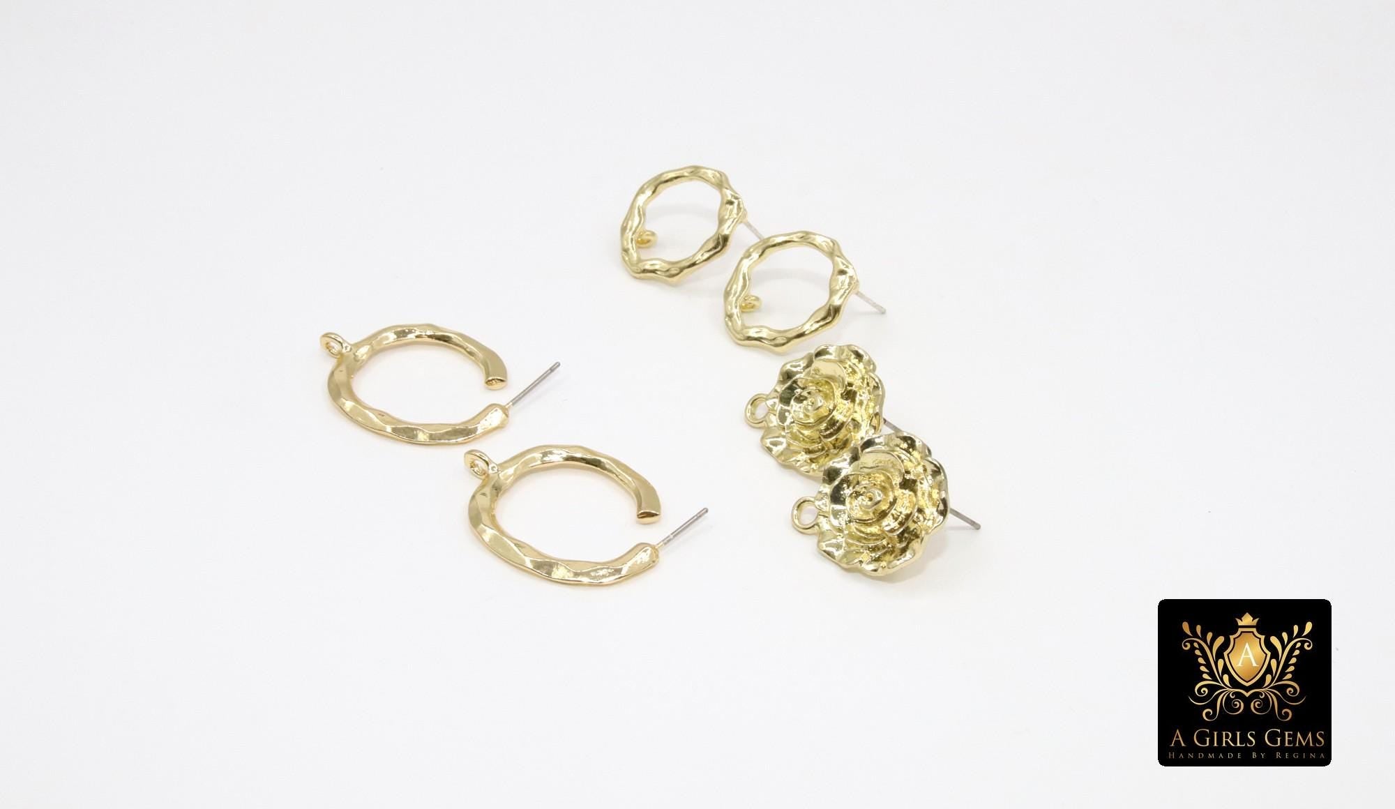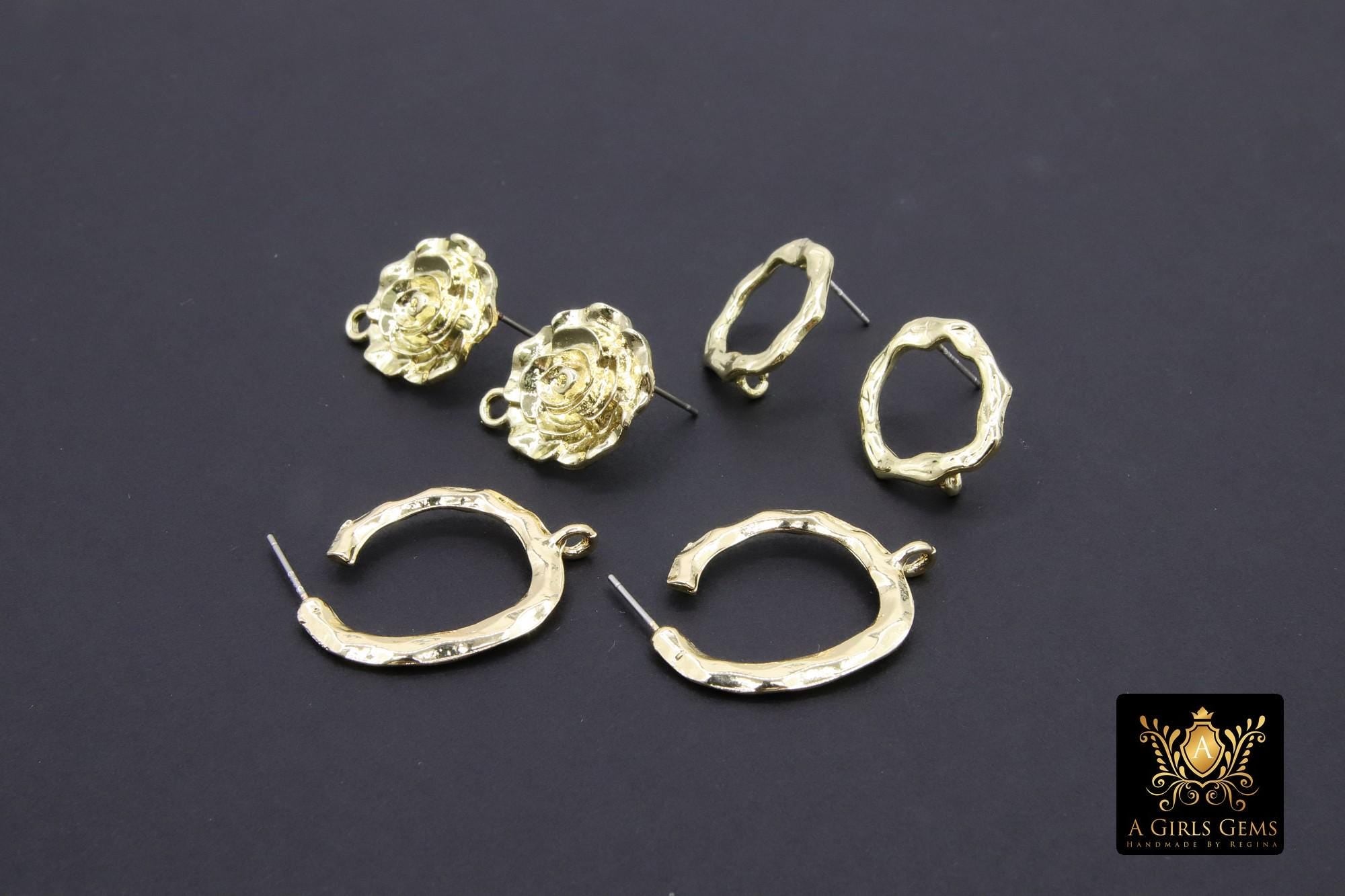 Gold Post Stud Earring Findings, Gold Plated Round, Oval, Square, Rectangle Shaped Post Earrings, 4 Styles, Posts with Loops For Charms