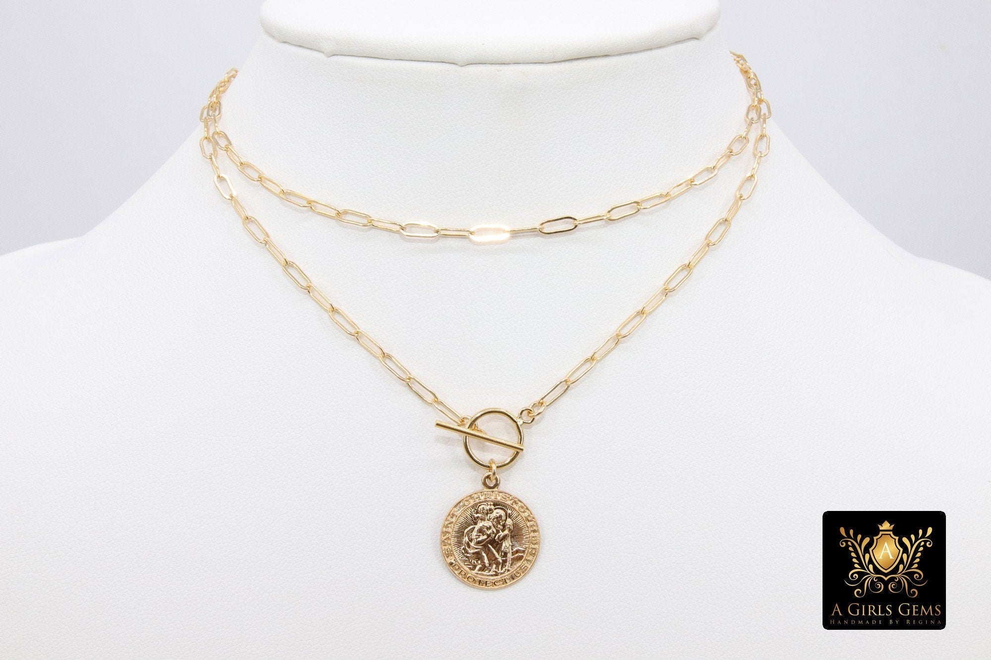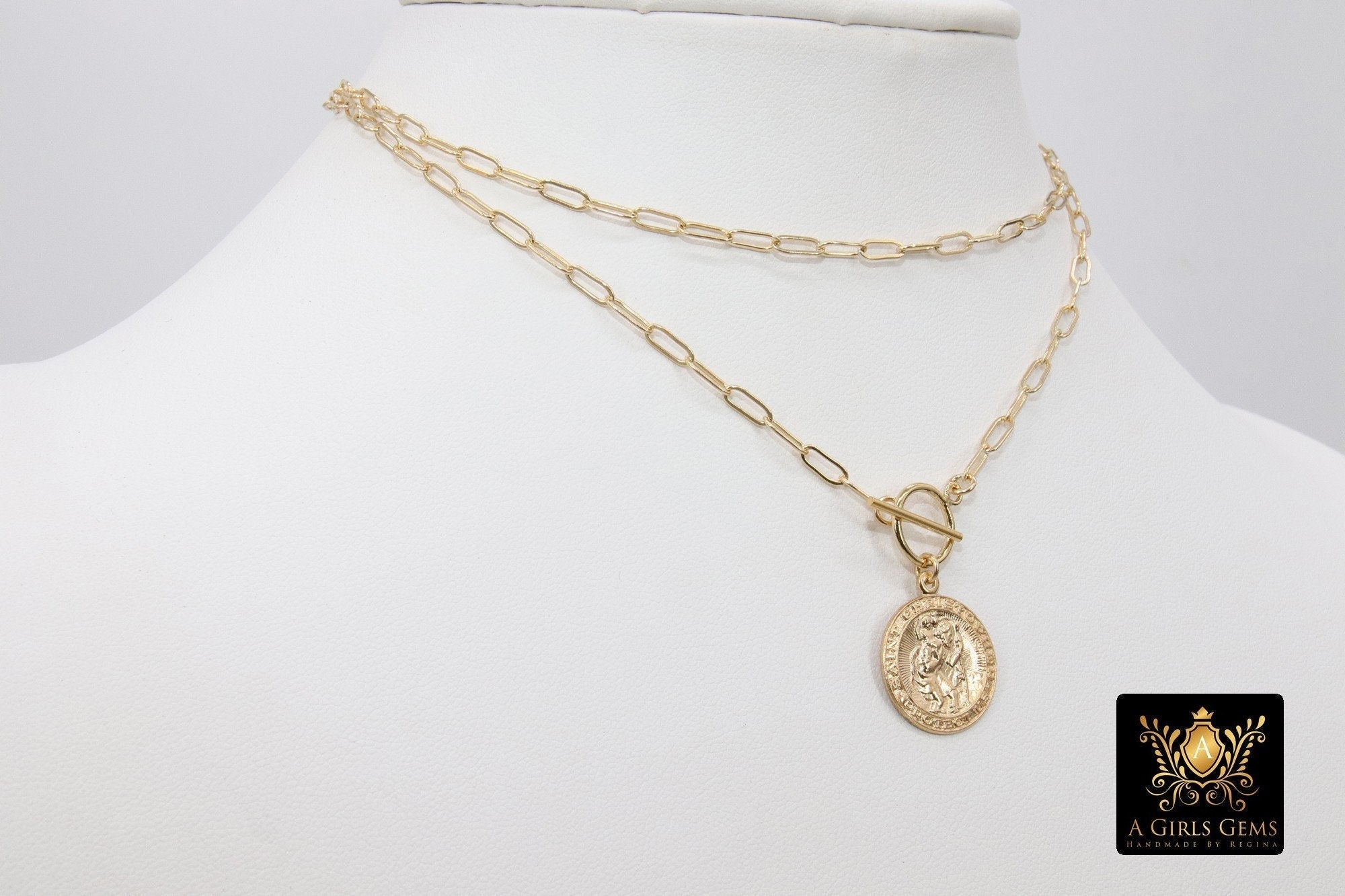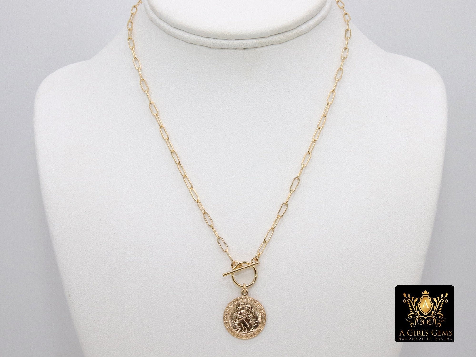 This necklace is on our 14 K Gold Filled Designer Rectangle Oval Drawn Chains as seen in picture 1, ***NOT plated *** will last a lifetime. Includes a 14 K Gold Filled Toggle. St. Christopher coin charm. Our most popular lengths are below. If you need a different length, please message us with any questions.