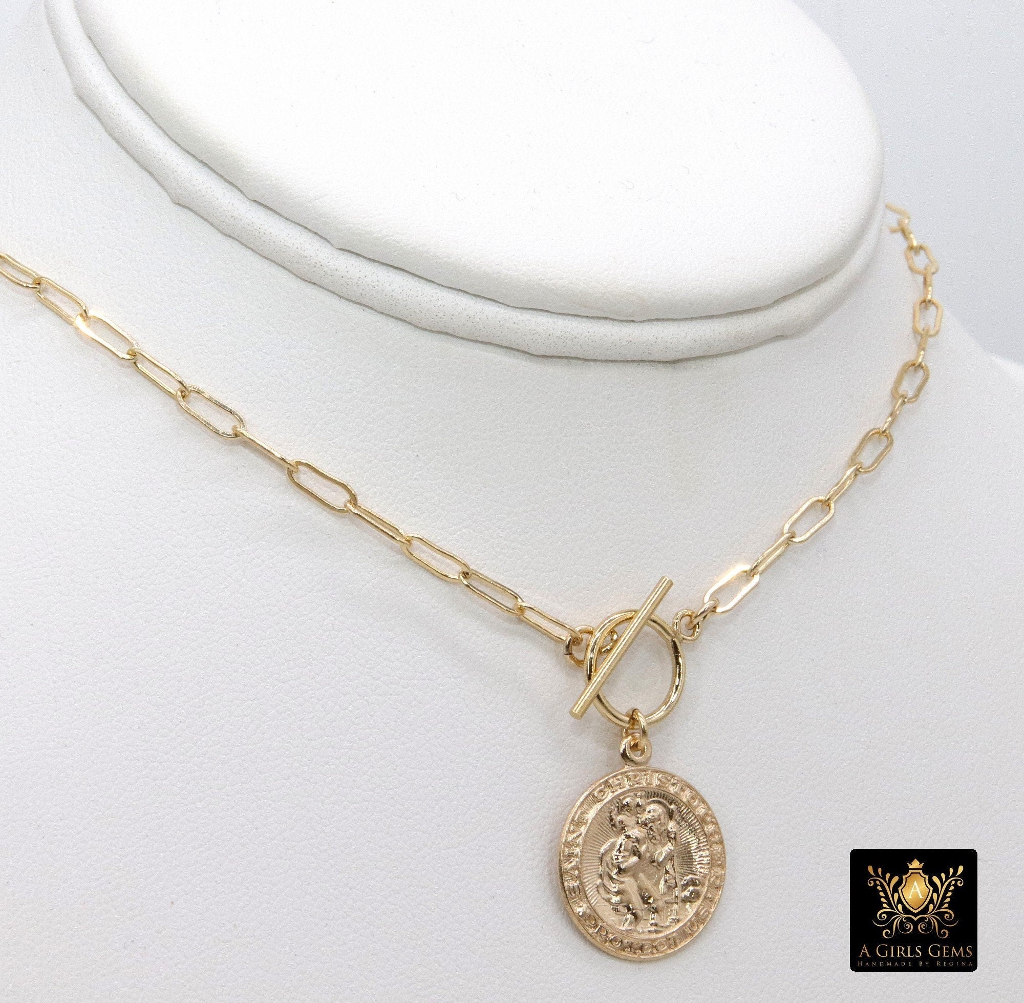 Protection Toggle Coin Necklace, Genuine 14 K Gold Filled Chain Necklace, St Christopher Medal Chunky Choker
