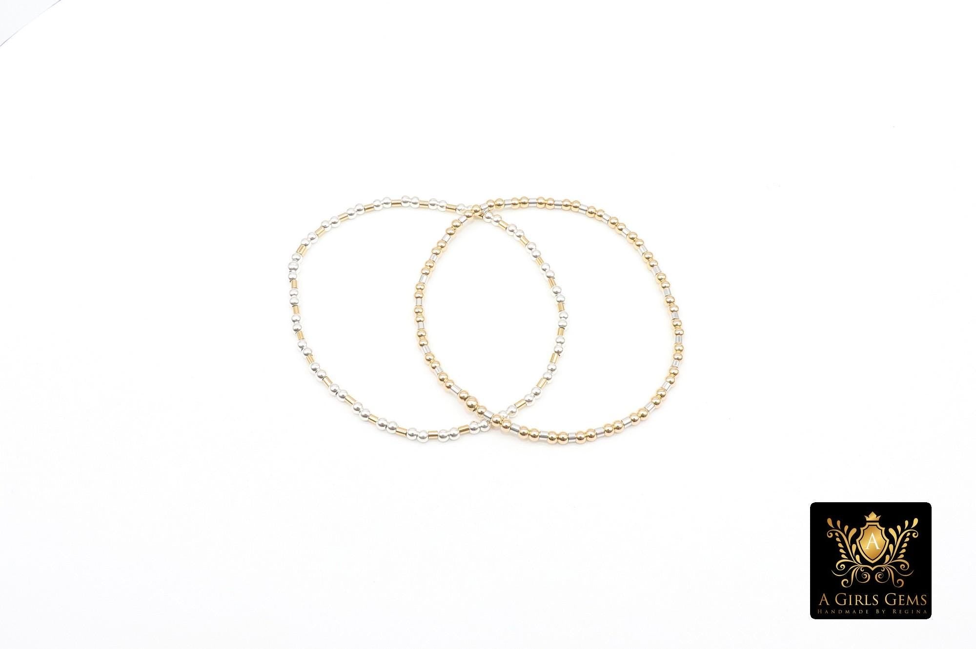 Mixed Metal Beaded Stretchy Bracelet, 925 Sterling Silver and 14 K Gold Filled Short Tube Bar Stacking Bracelets, Handmade