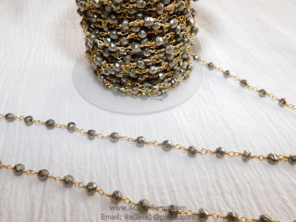 Pyrite Beaded Rosary Chain, Natural Faceted 4 mm Pyrite Bead CH# 501, Quality Gold Plated Wire Wrapped Jewelry Chains