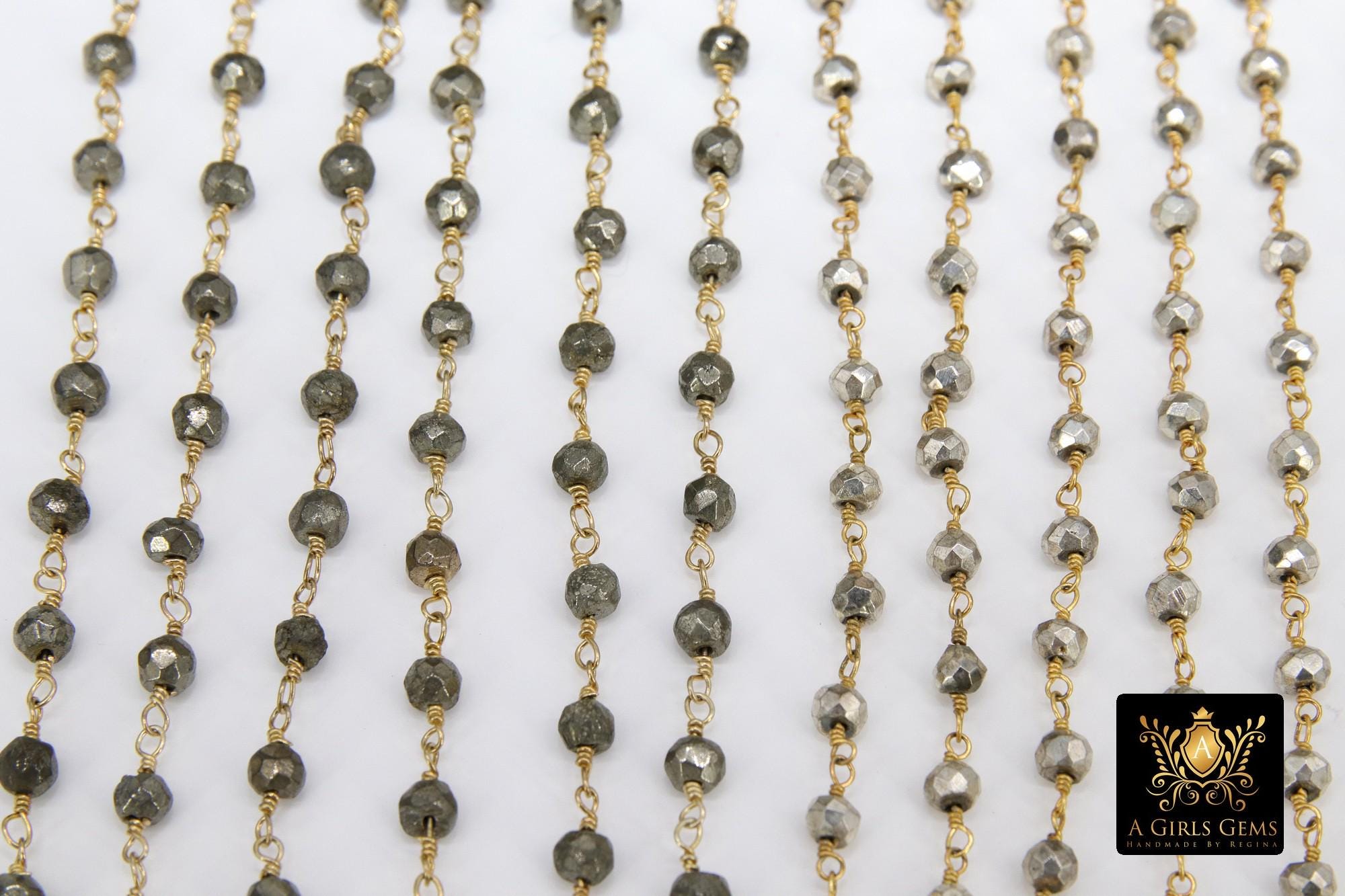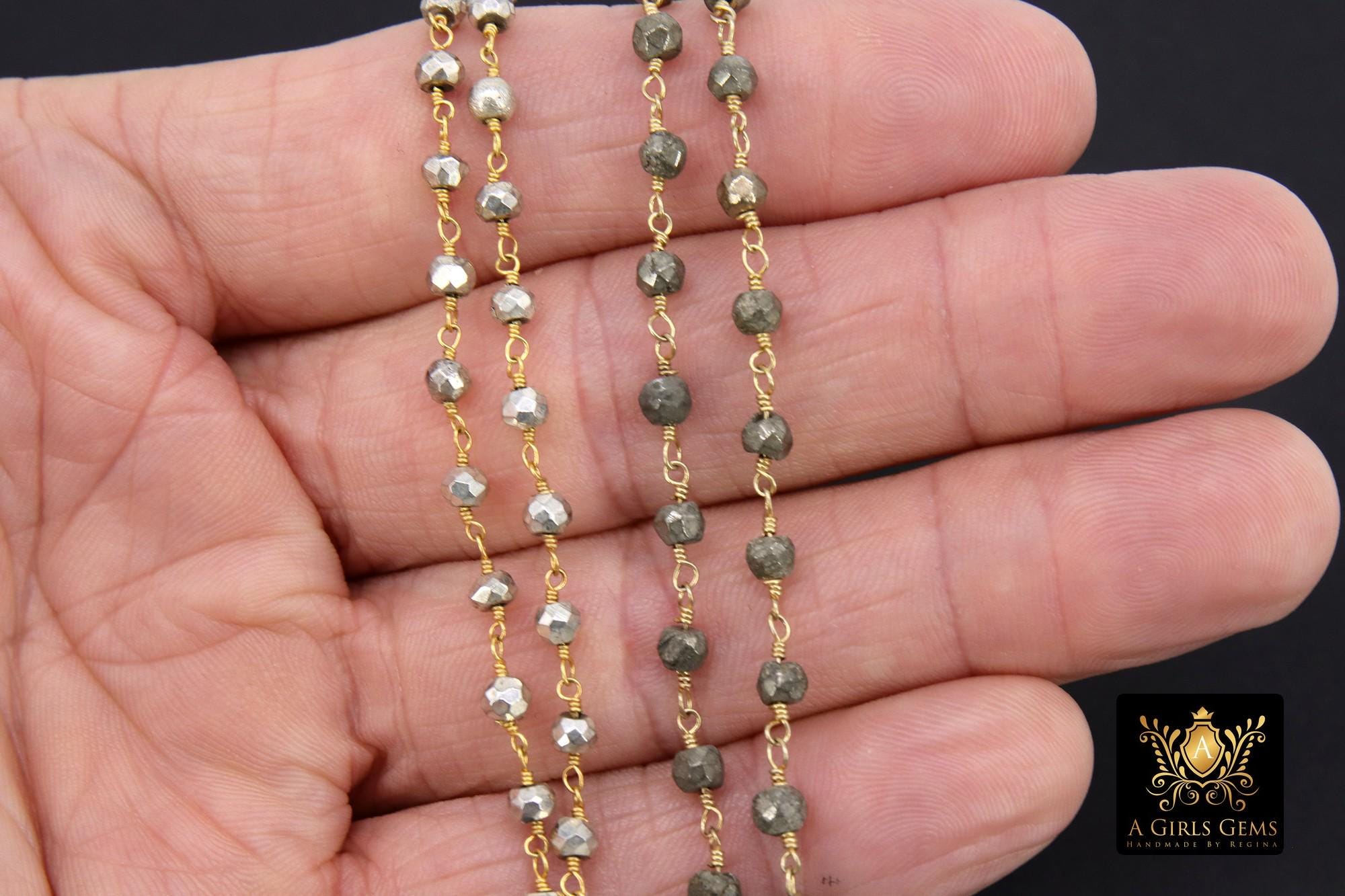 Pyrite Rosary Chain, Natural Faceted Pyrite Bead or Light Coated Pyrite, Quality Gold Plated Wire Wrapped Chains, 4 mm Rosary Chain by the Foot