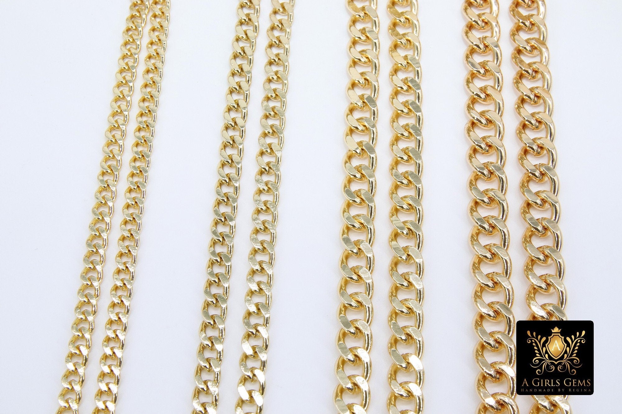 This chain has a diamond cut edge and comes in four different sizes. The pictured chains in the photo shows the width sizes of each chain. These are plated steel chains and you will find them to be more of the gold plating that you find on our brass chains as far as the color.