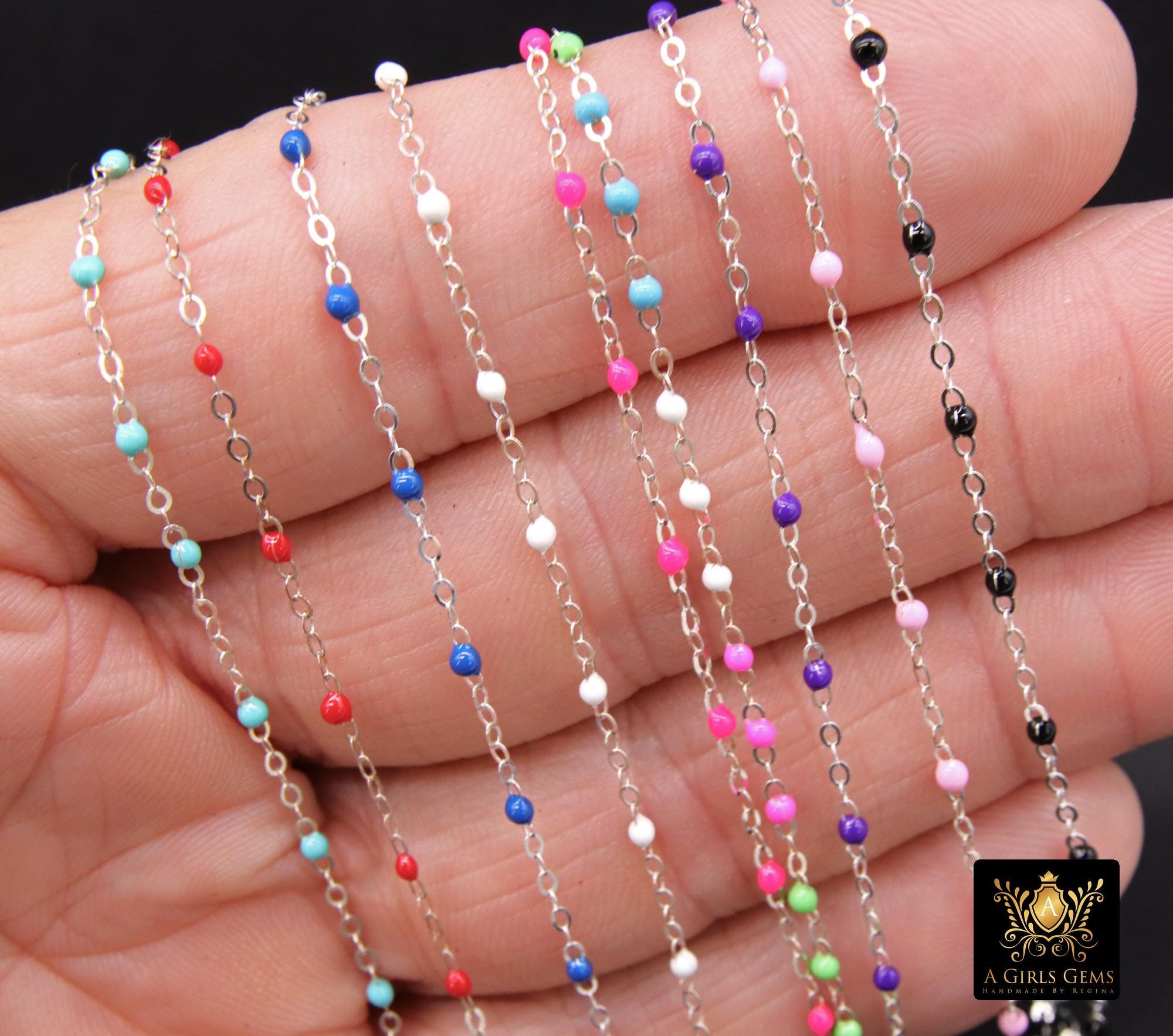 Choice of color of beaded enamel Satellite chains in 925 Sterling Silver. Mix and match colors for any event! Great for Spirit or Sports events necklaces. This is a lightweight chain that is soldered between each link. Bead sizes, bead placement, and chain colors can vary. Can use Jump ring size: 24~20 gauge and beads are approximately 2 mm but may vary.