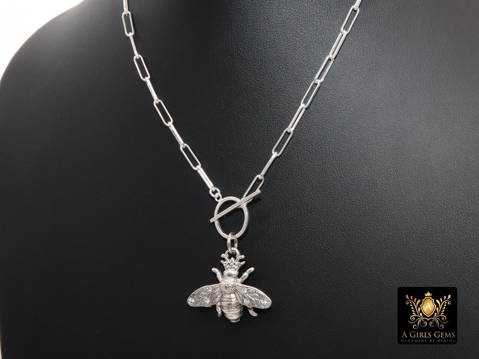 Queen Bee Chain Necklace, 925 Sterling Silver Toggle, Bumble Bee Rectangle Chunky Drawn Chain