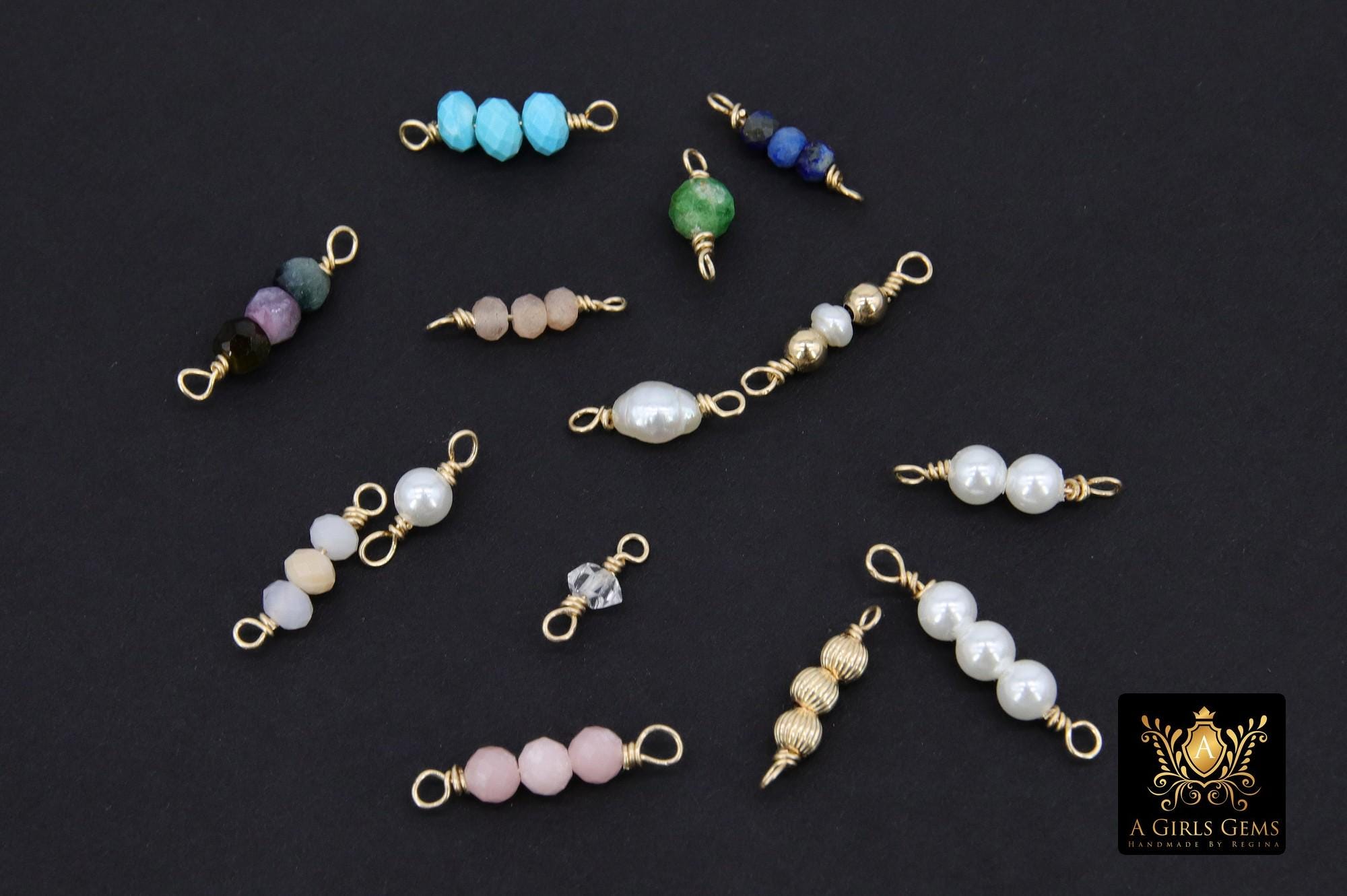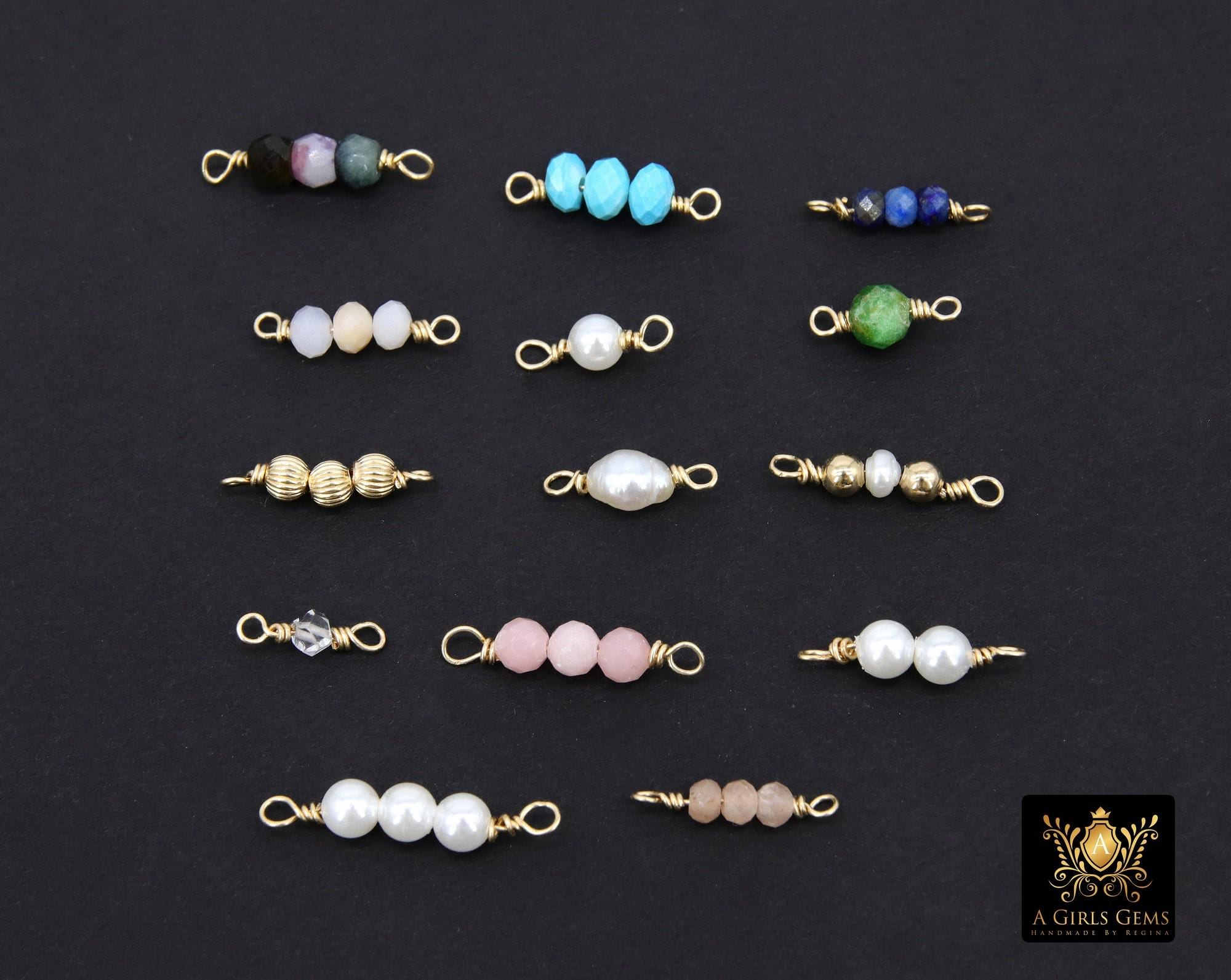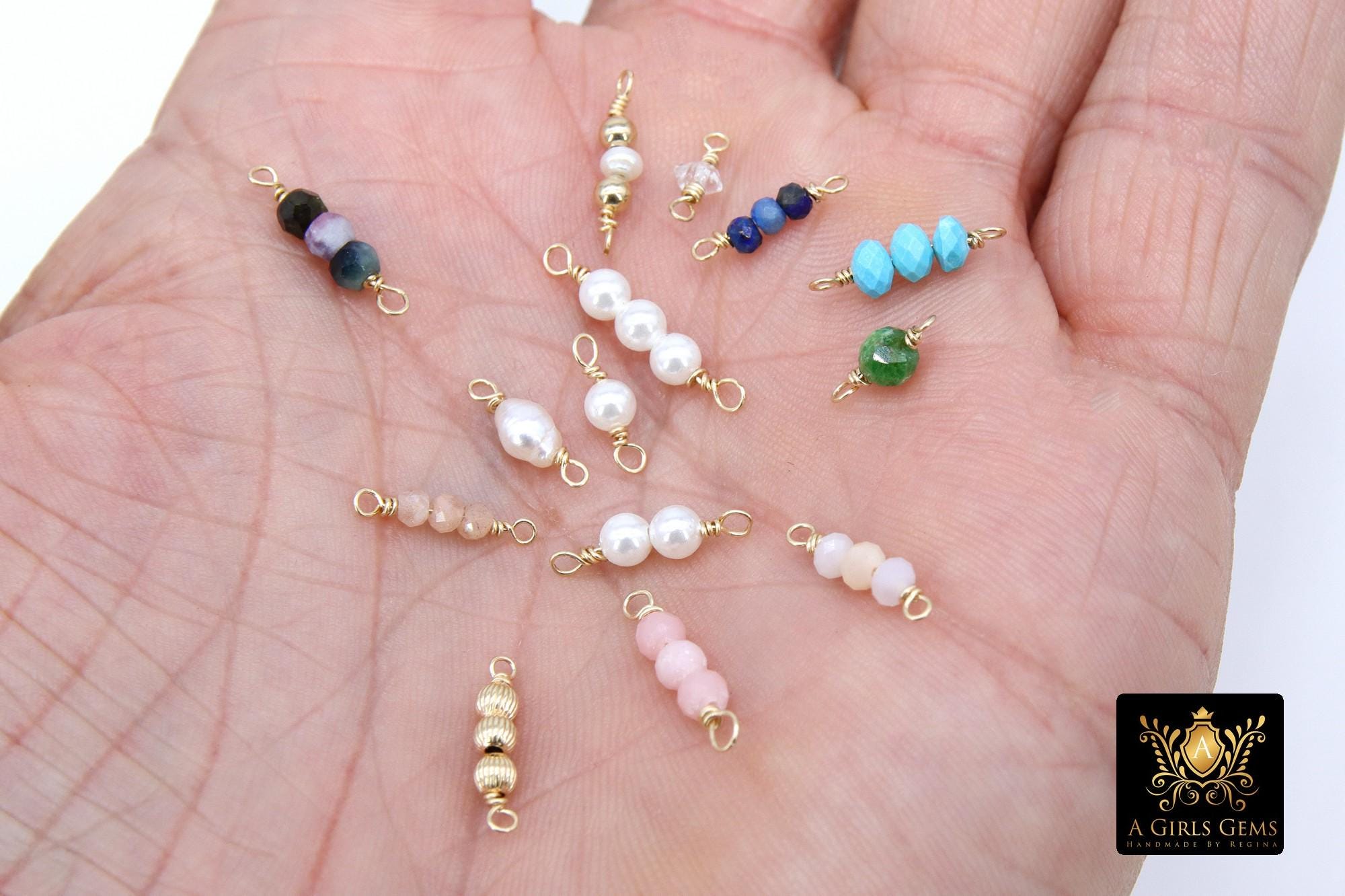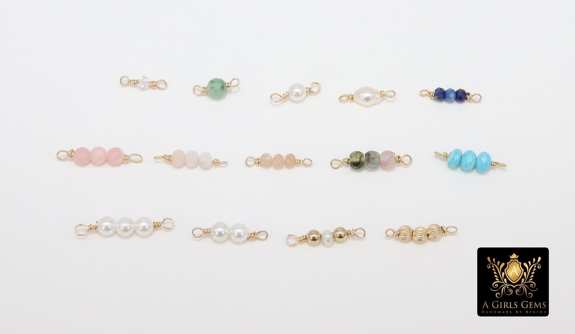 14 K Gold Wire Wrapped 3 Beads Connectors, 1 Beaded Gemstone Faceted Links # 3603, Permanent Jewelry