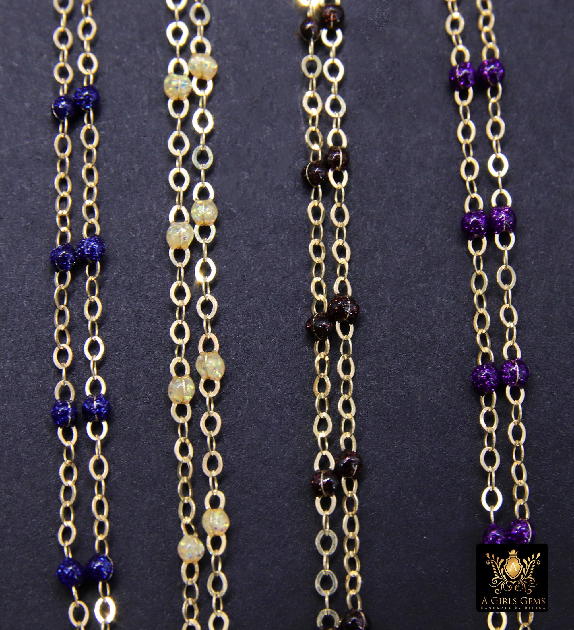 Genuine 14 K Gold Filled Dainty Beaded Satellite Chain, Handmade Chains in Fuchsia Pink, Black, Blue Turquoise, Navy Blue, Multi Color, White, Purple, Lavender, and New Pearlized Chains Unfinished Chains Soldered Links.
