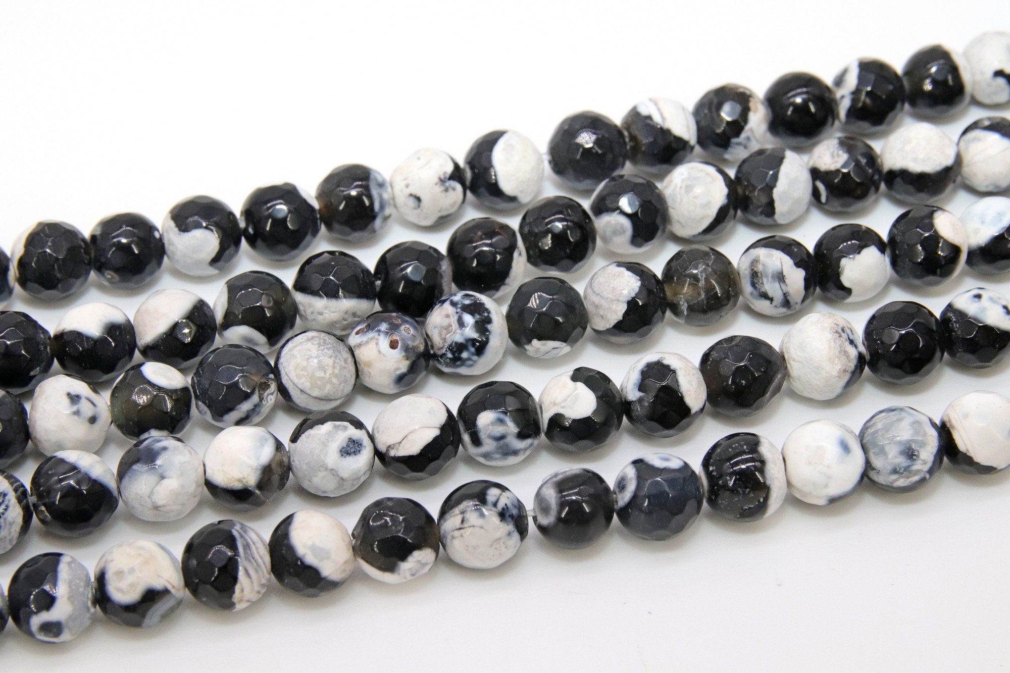 Full Strand of Black and White Fire Agate Faceted Cut Beads in 8 mm
