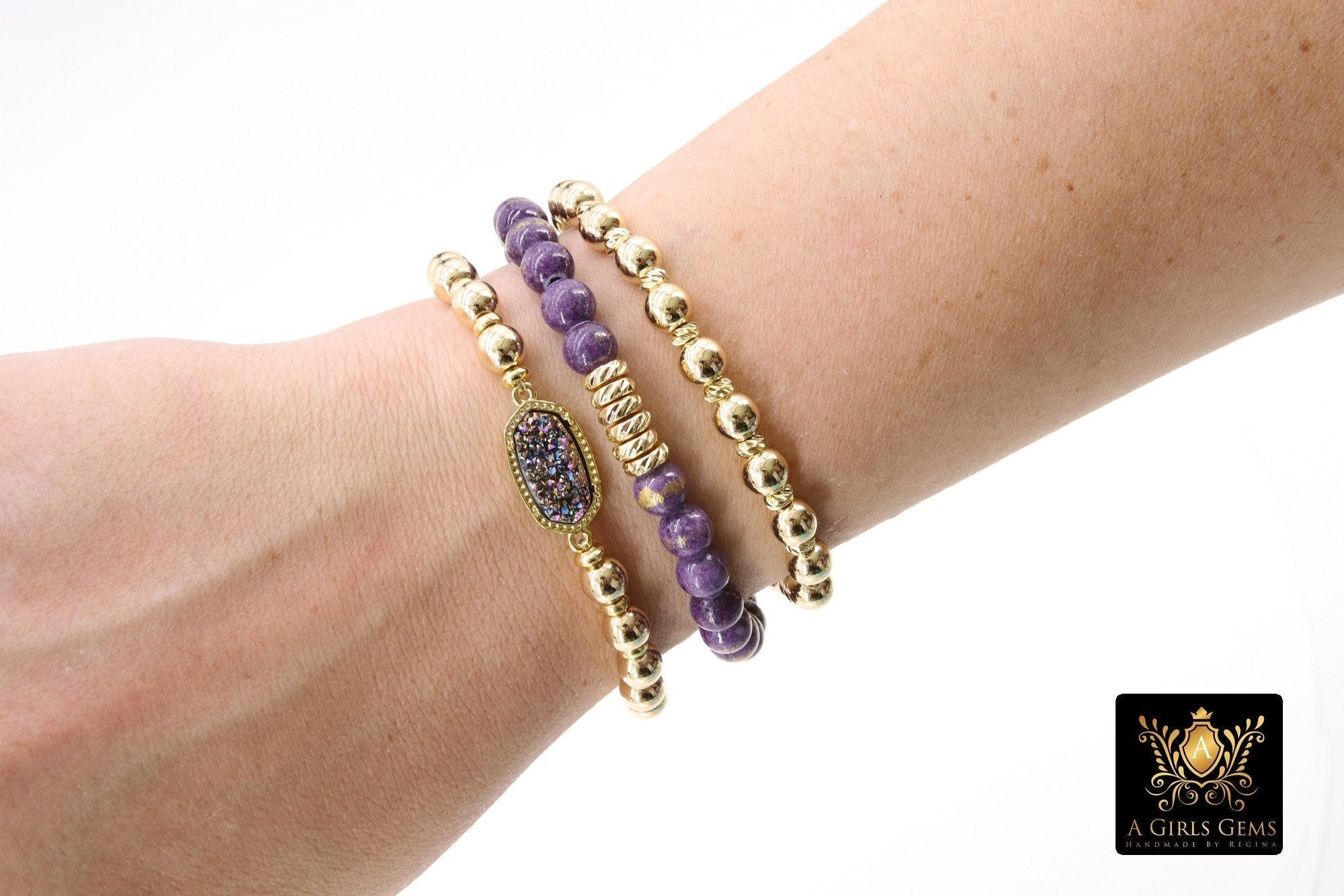 Purple And Gold Beaded Bracelet, 6 mm Gold Stretchy Bracelet #795, Dainty Rondelle LSU Heishi Tigers Charm Bracelet