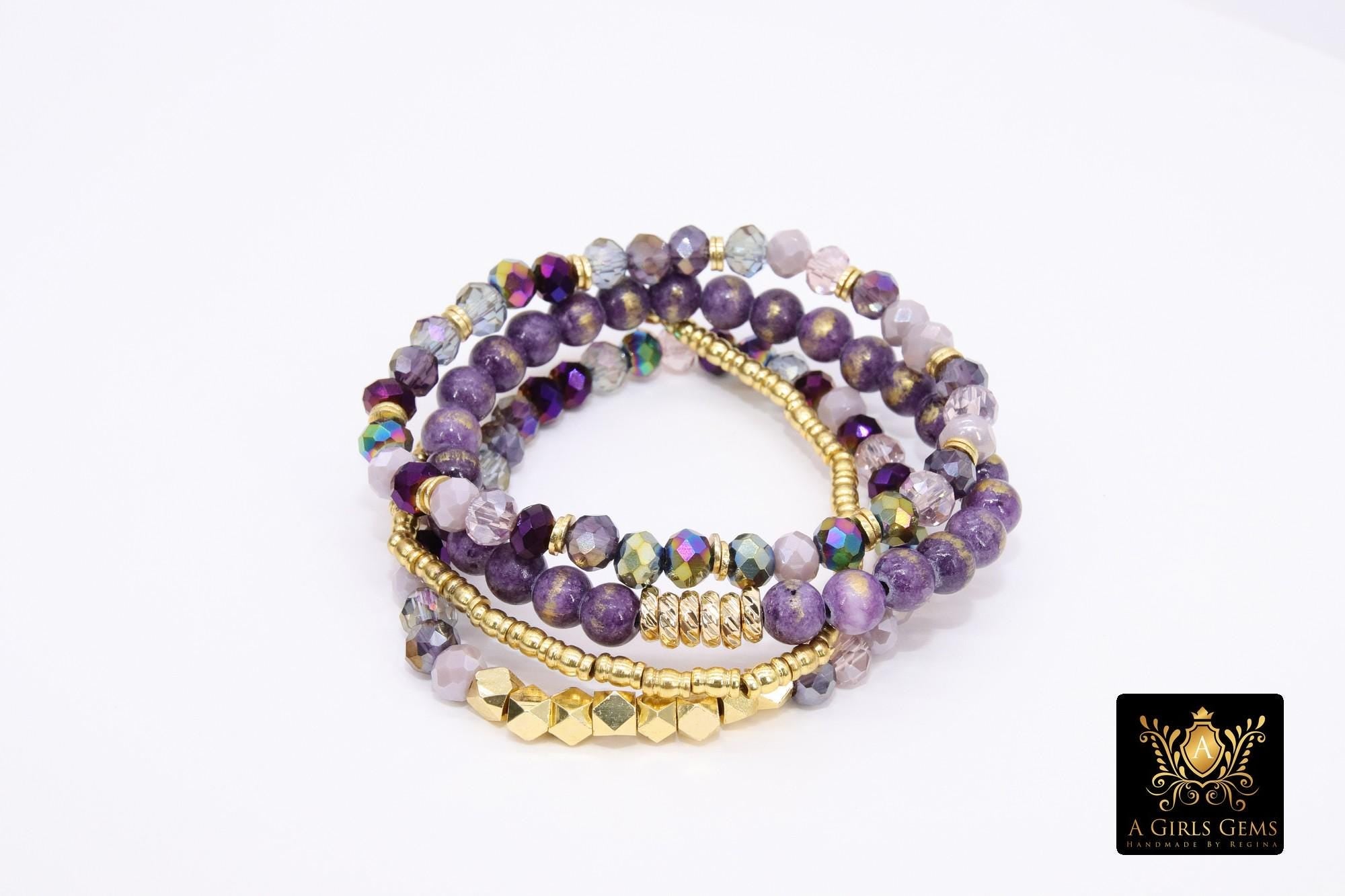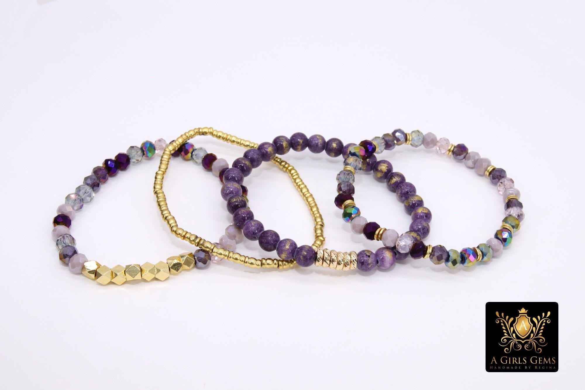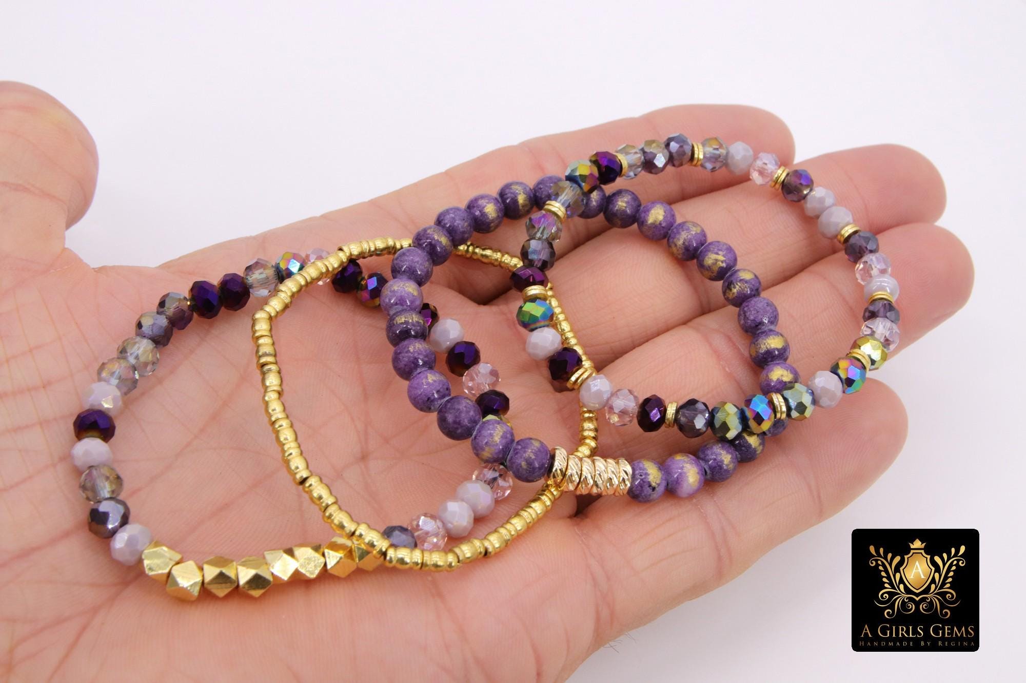 These bracelets are in a purple and gold colors with heishi beads and gold metal beads with your choice of bracelet style. If you need a smaller or extra large size in the bracelet, please leave us a note with your order.
