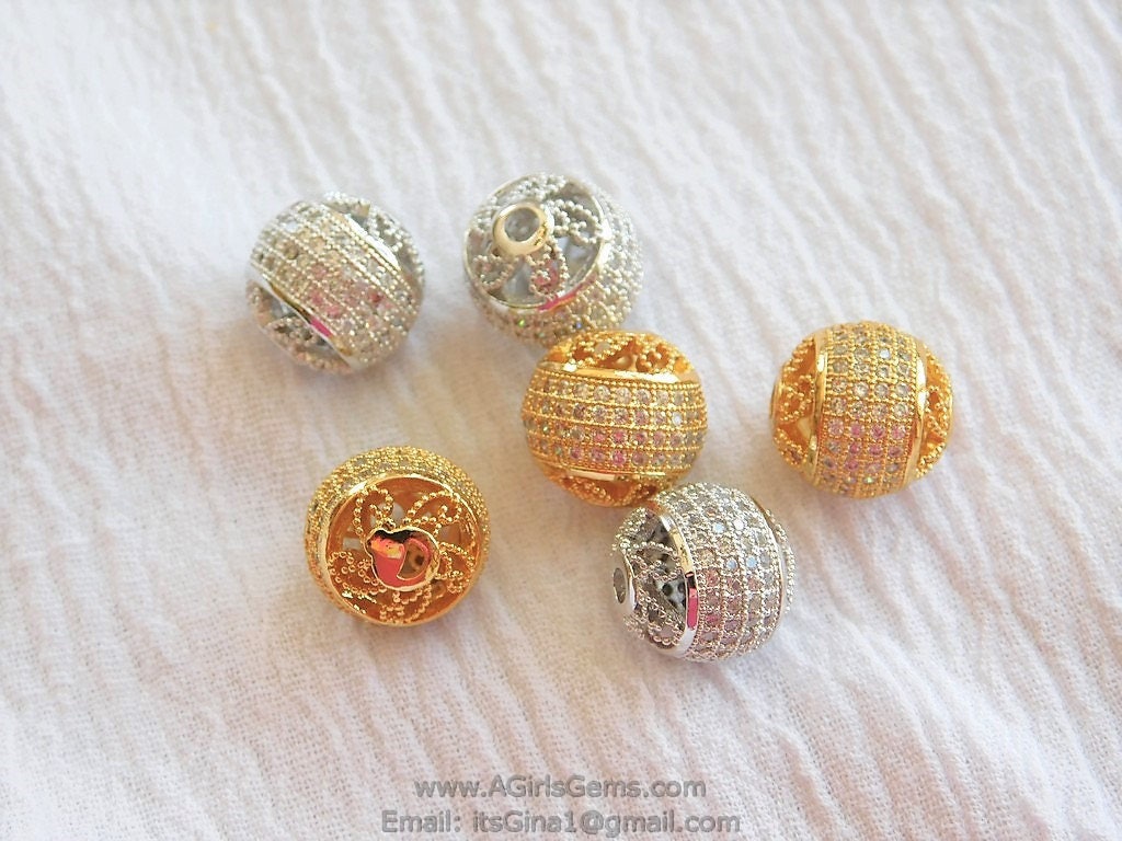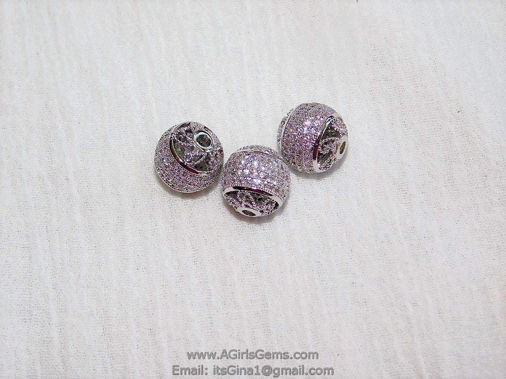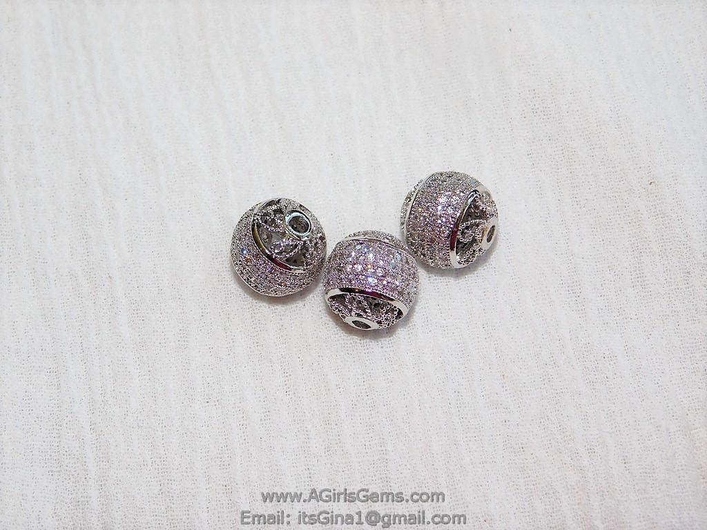 12 mm Filigree Round Micro Clear Paved Bead Silver Rhodium Plated Shamballa Round Cubic Zirconia Paved