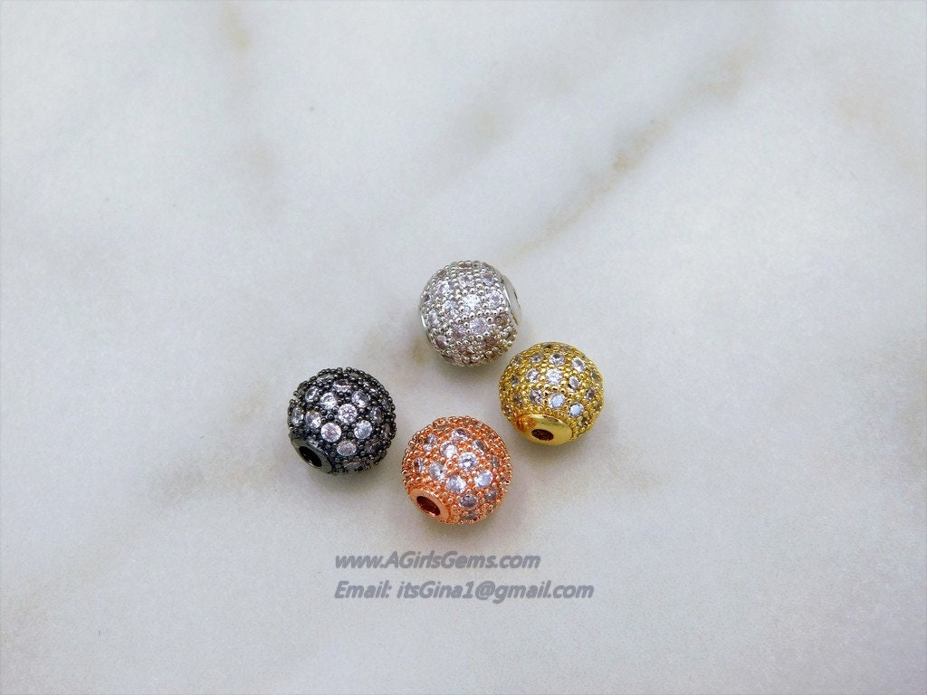 CZ Micro Pave Round Beads, Rose Gold CZ Round Beads, Silver Cubic Zirconia Diamond Pave