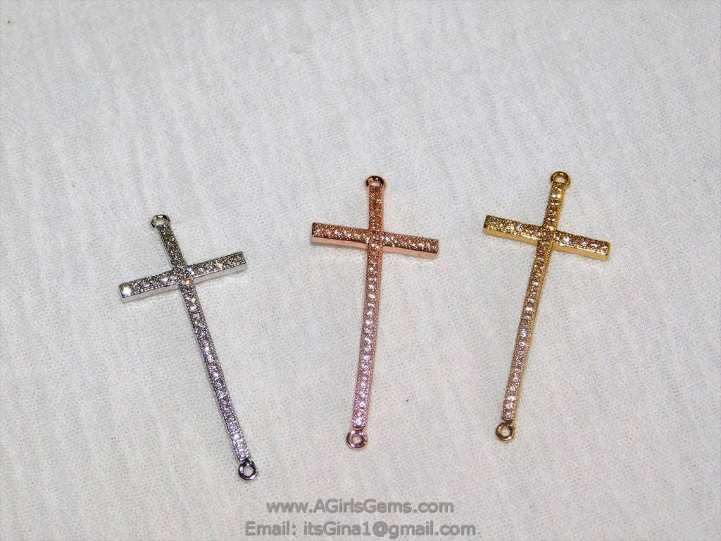 CZ Cross Connectors, Micro Pave Bracelet Cross Connector Beads, 16 x 33 mm, Cubic Zirconia Gold, Rose, Silver Plated.