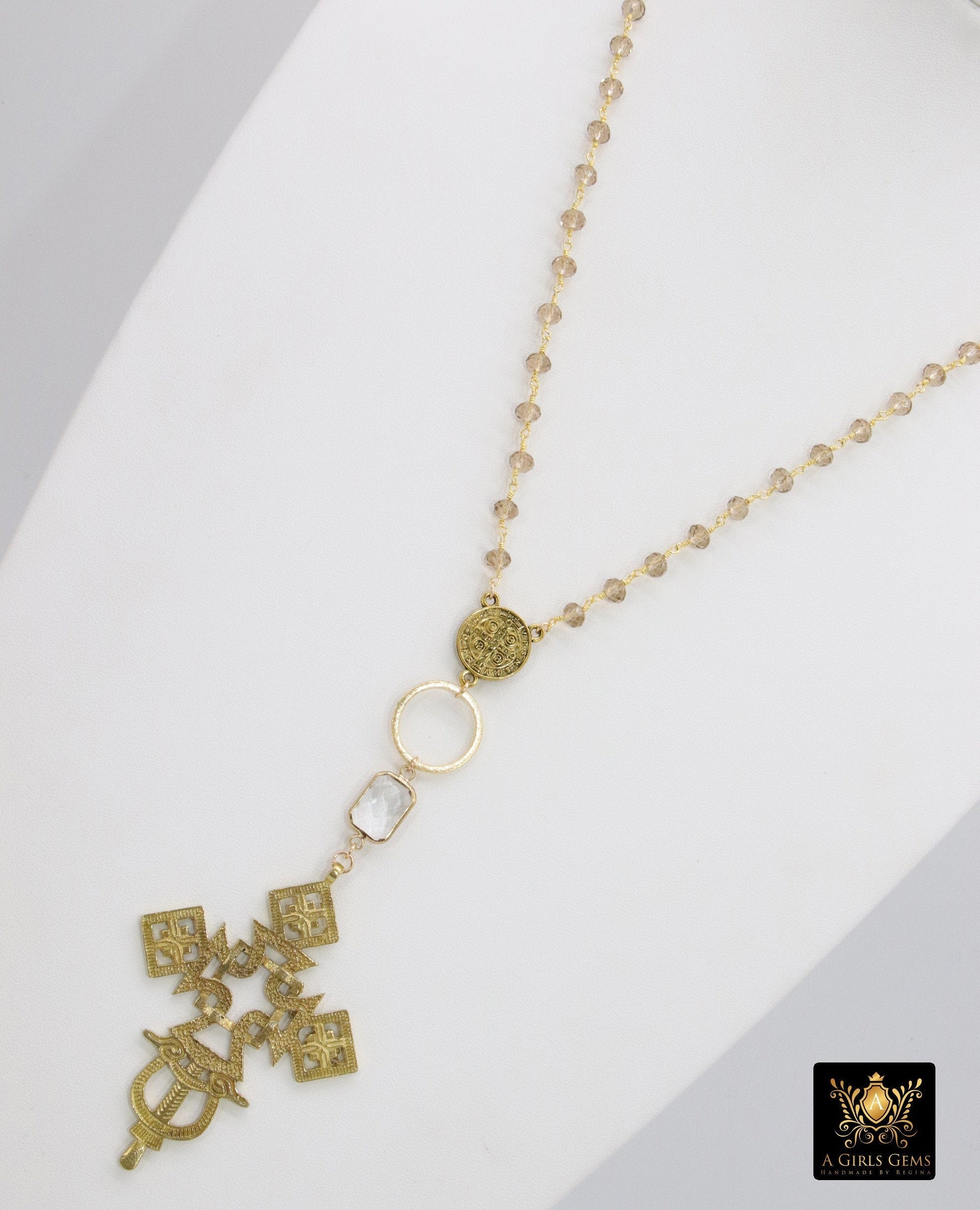 Gold Rosary Cross Necklace on Smoky Gray Rosary Chain Gold Brass Ethiopian Cross Necklace Rosary Chain By Regina Harp Designs