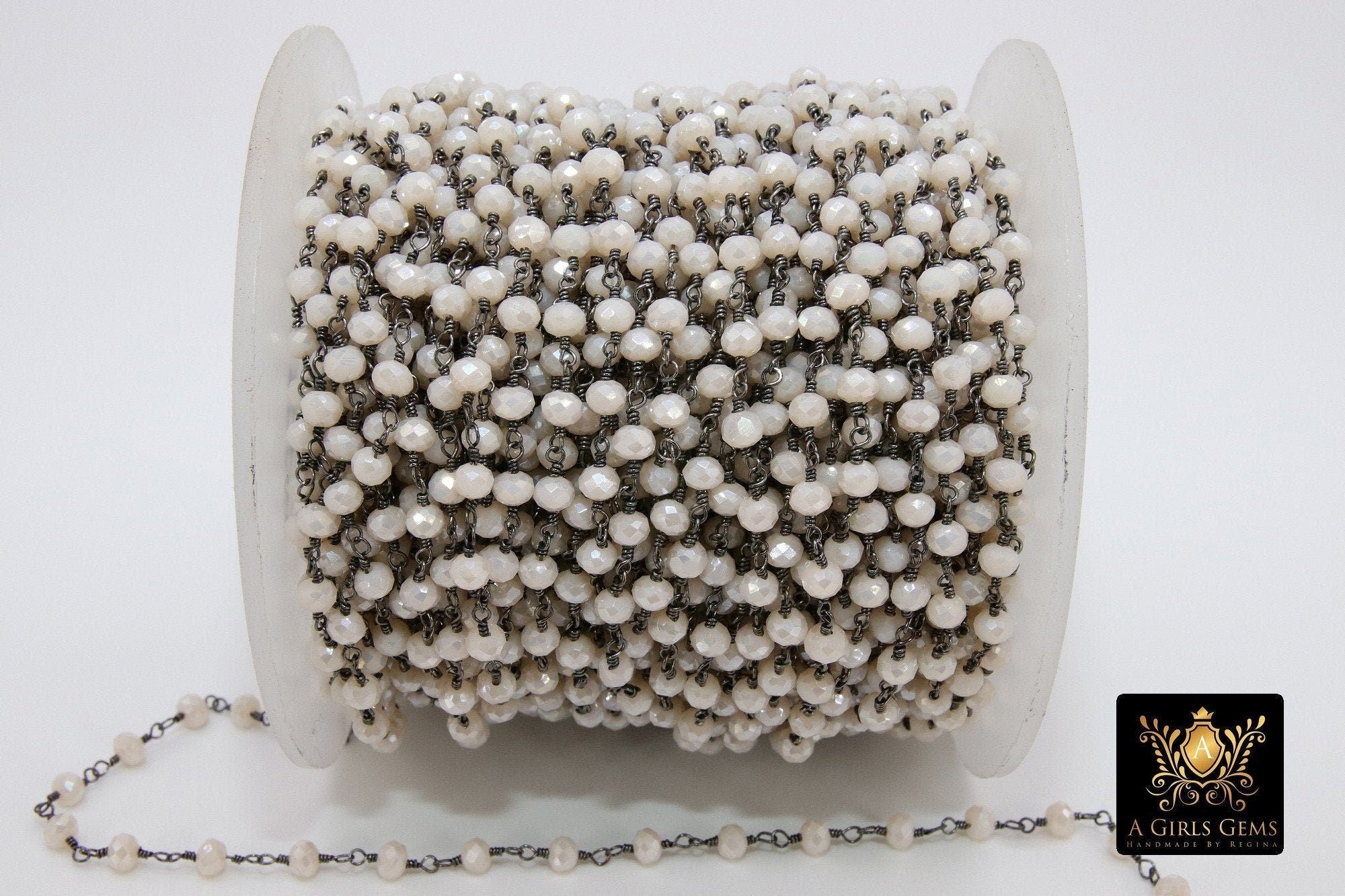 Light Cream Rosary Chain, 4 mm Gunmetal Black Wire Wrapped CH #301, Beige AB Crystal Beads