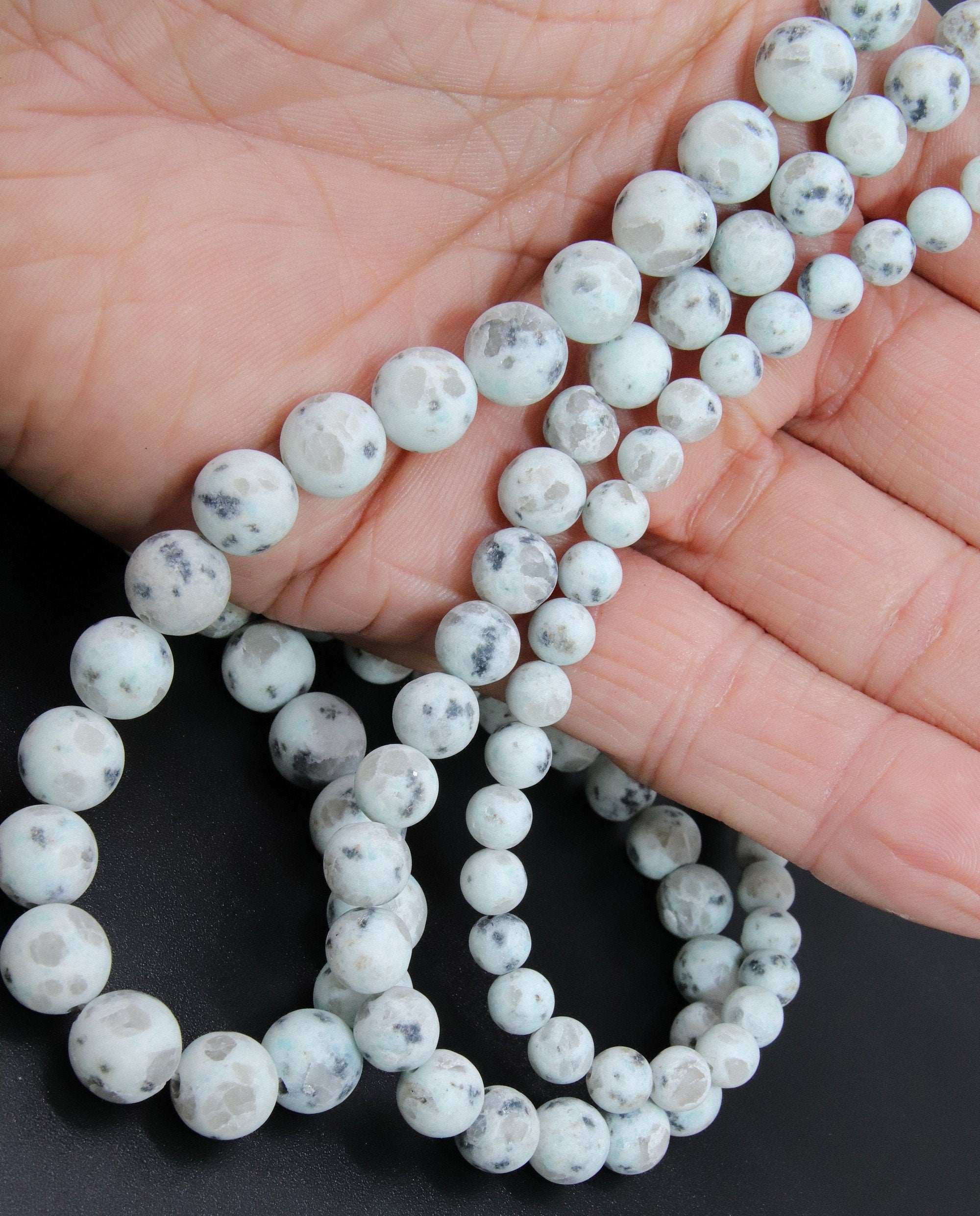 Beautiful strand of Kiwi Sesame Baby Blue Jasper Beads in shades of light blues, black spots and flecks to light grays and whites. The frosted Kiwi beads gives more of a baby blue color then the green aqua colors.