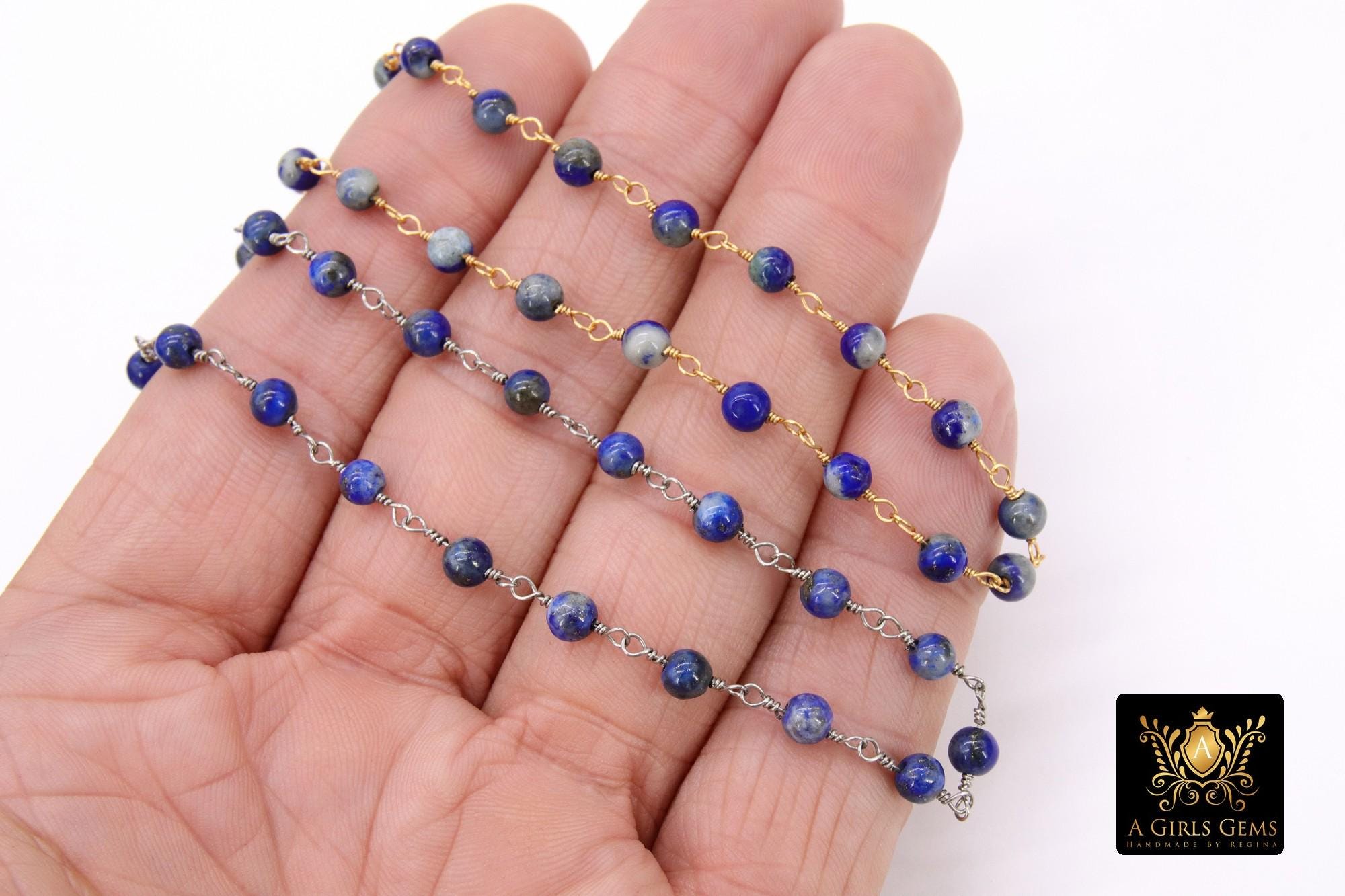 Navy Blue Wire Wrapped Rosary Gold Chain, 4 mm Beaded Natural Lapis Lazuli Unfinished Rosary Silver Chain CH# 404, By The Foot
