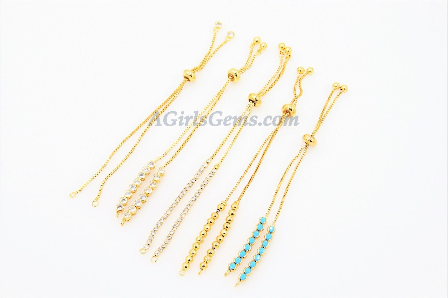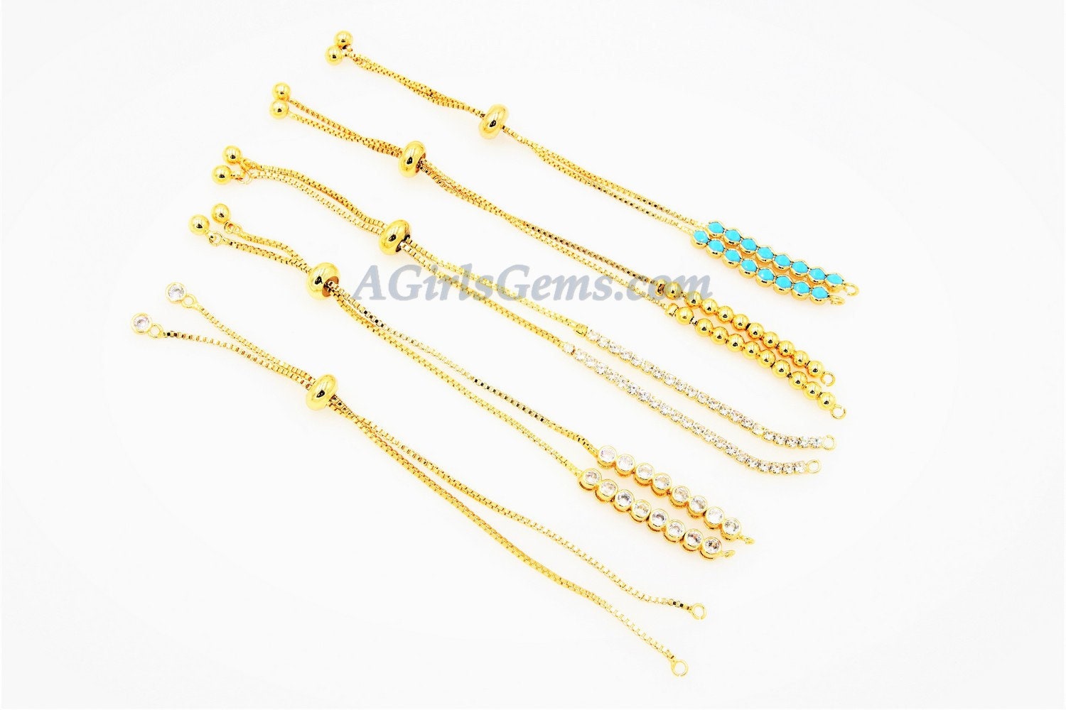 Gold Plated Adjustable Bracelets, Unfinished Chain Bracelets, CZ Connector Bracelets Slide Stopper Bead. Adjustable Half Bracelets. Ends of bracelets have ball or cz dangle.