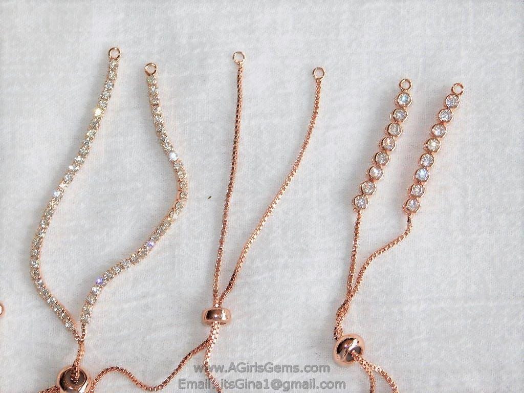 Adjustable Bracelets to choose from in Rose Gold Plated Adjustable Unfinished Chain Bracelets CZ Turquoise Blue Connector Bracelets Slide Stopper Bead. 3 to choose from. Listing is for only one bracelet.