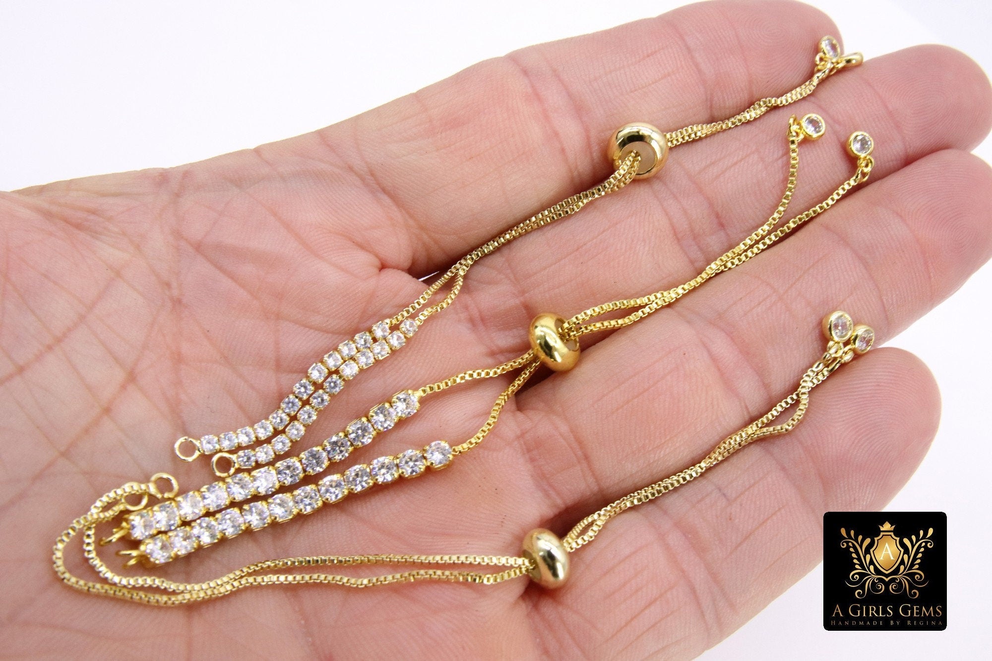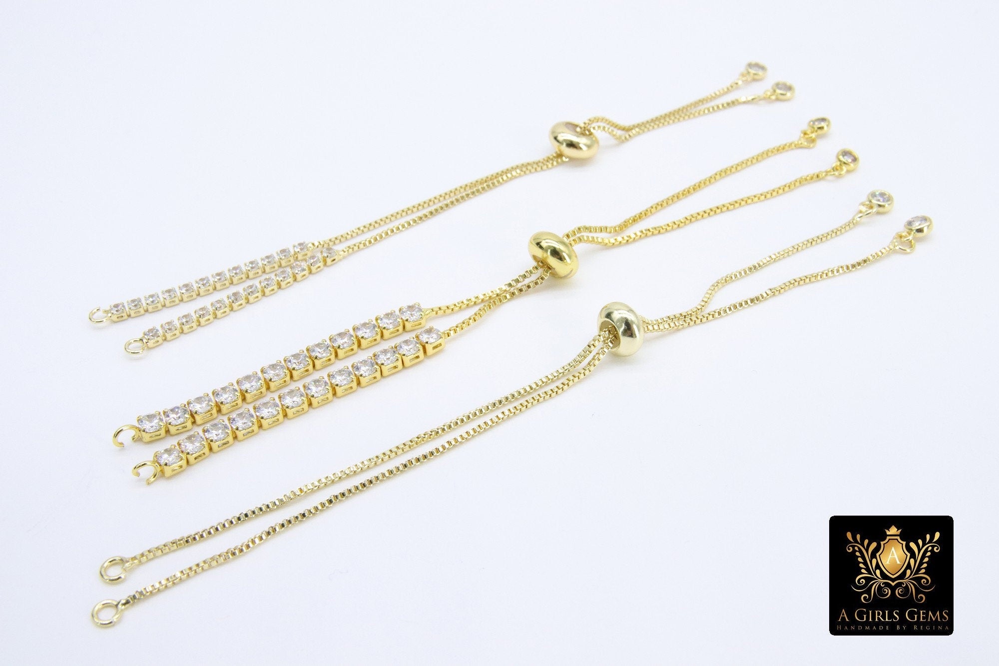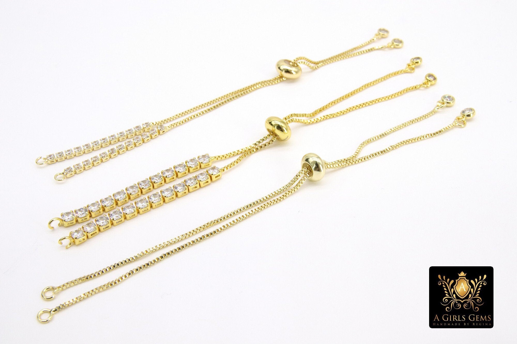 Gold Plated Adjustable Bracelets, Unfinished Chain Bracelets, CZ Connector Bracelets Slide Stopper Bead. Adjustable Half Bracelets. Ends of bracelets have ball or cz dangle.