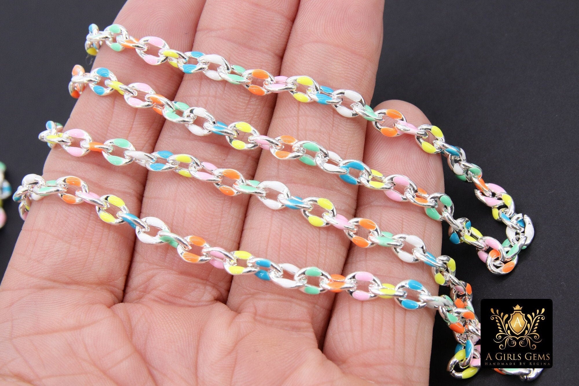 Dainty Silver Oval Satellite Enamel Chain, Rainbow Silver Necklace Rolo Chain CH #642, By the Foot Unfinished