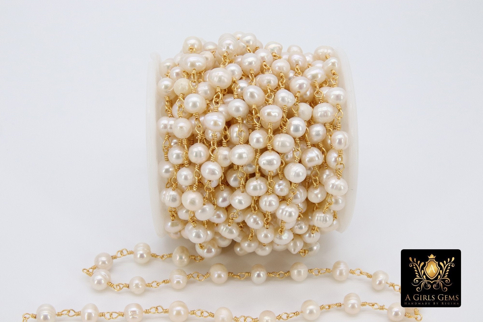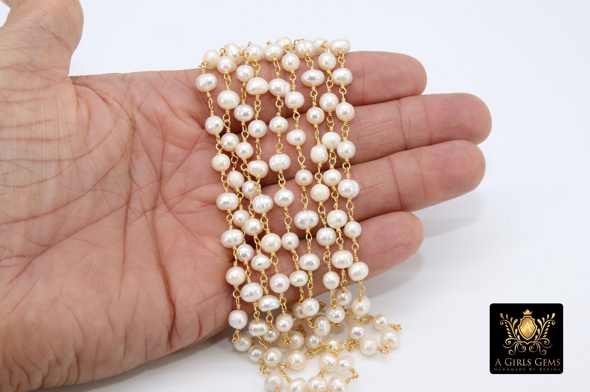 Freshwater Pearls, 6 mm Gold Wire wrapped Rosary Chain, Pearl Rosary Chain Boho Jewelry Chains