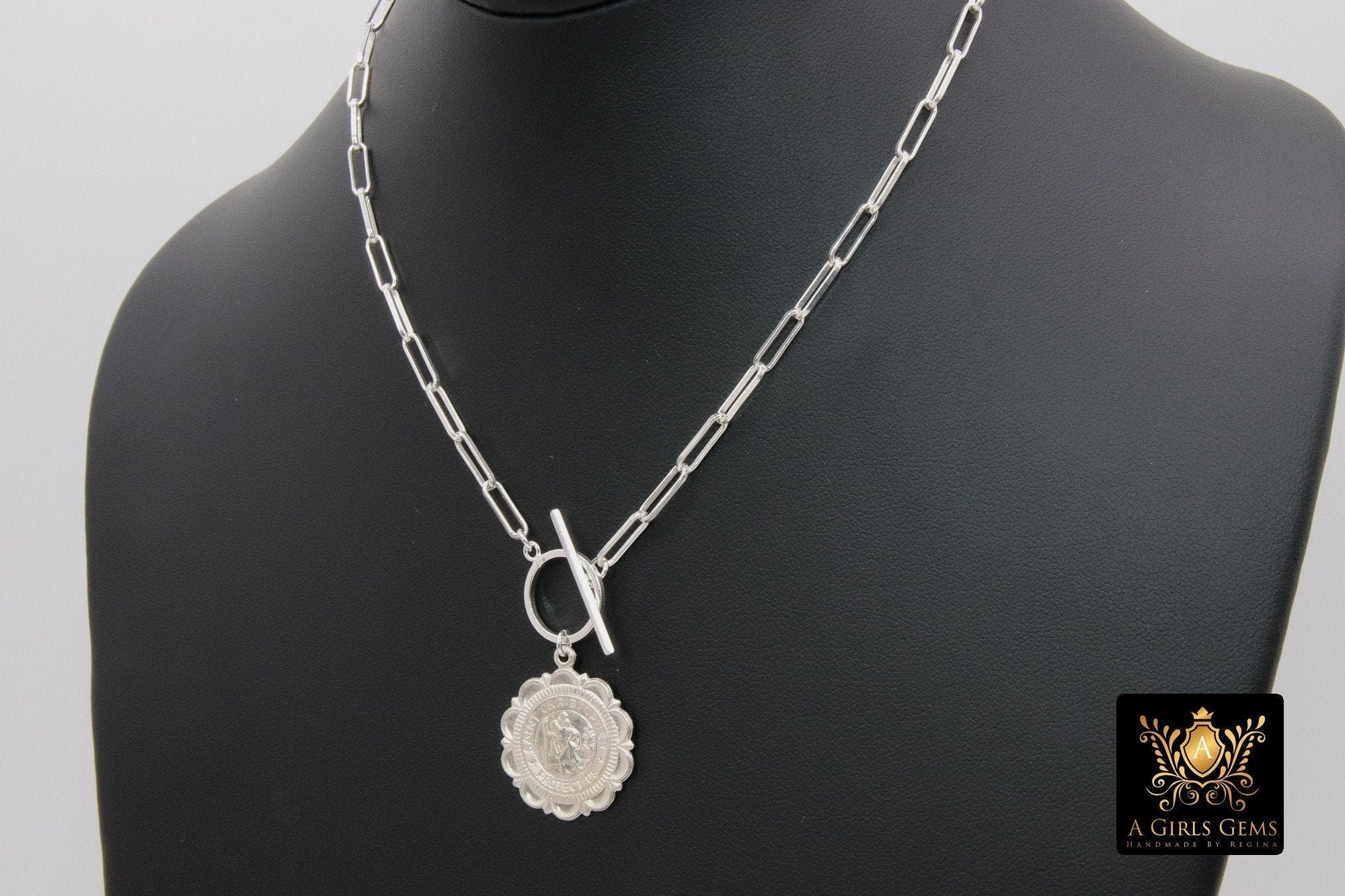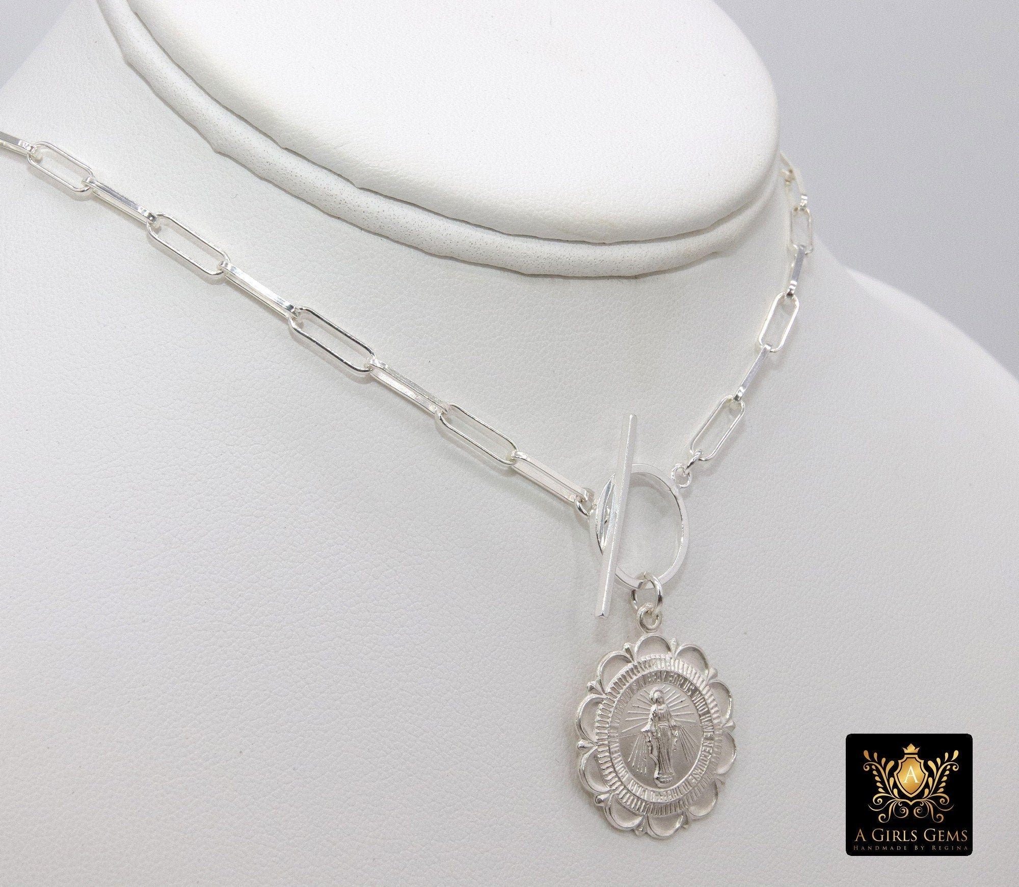 Silver Virgin Mary Coin Necklace, 925 Sterling Silver Medal Toggle Wrap Necklace, Paperclip Rectangle Chain